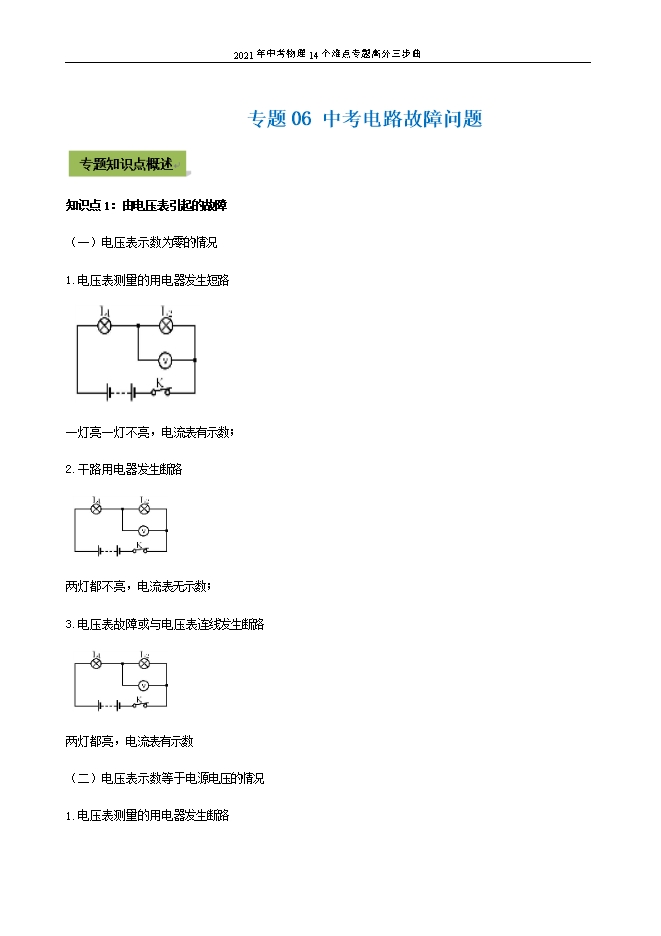 专题06 中考电路故障问题---2021年中考物理14个难点专题高分三步曲(原卷版和解析版)