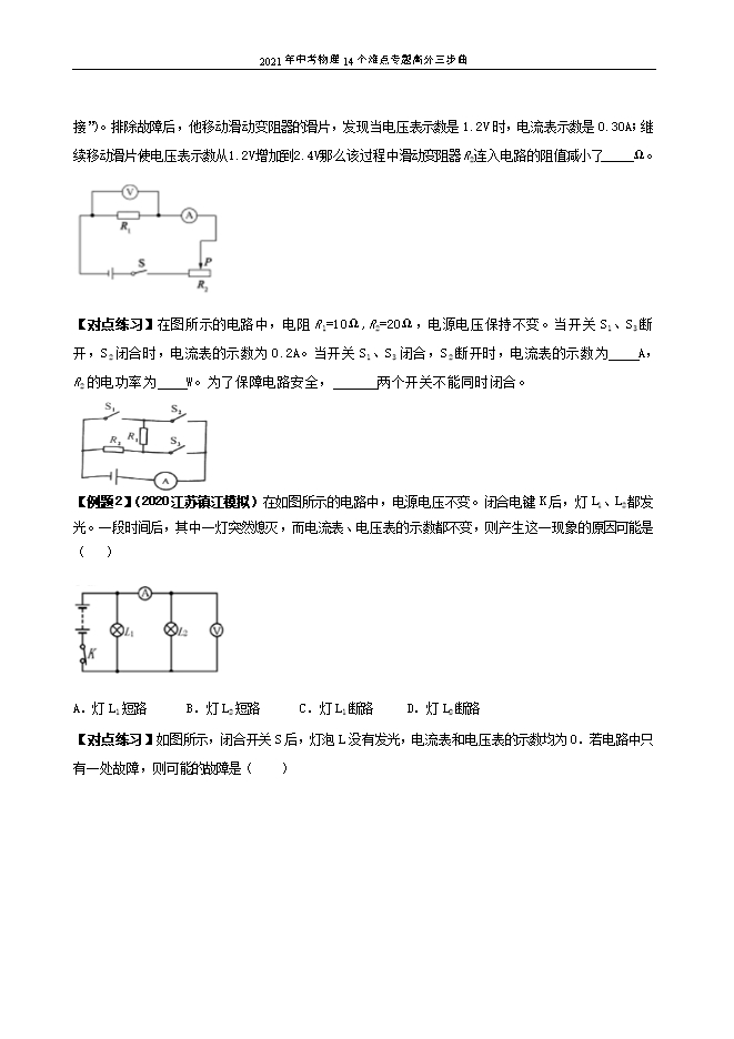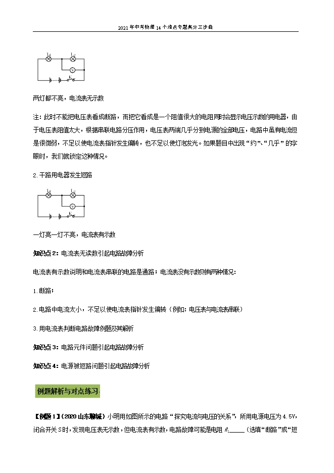 【内容简介】知识点1:由电压表引起的故障(一)电压表示数为零的情况1.电压表测量的用电器发生短路 一灯亮一灯不亮,电流表有示数;2.干路用电器发生断路 两灯都不亮,电流表无示数;3.电压表故障或与电压表连线发生断路 两灯都亮,电流表有示数(二)电压表示数等于电源电压的情况1.电压表测量的用电器发生断路 两灯都不亮,电流表无示数注:此时不能把电压表看成断路,而把它看成是一个阻值很大的电阻同时会显示电压示数的用电器,由于电压表阻值太大,根据串联电路分压作用,电压表两端几乎分到电源的全部电压,电路中虽有电流但是很微弱,不足以使电流表指针发生偏转,也不足以使灯泡发光。如果题目中出现“约”、“几乎”的字眼时,我们就锁定这种情况。2.干路用电器发生短路 一灯亮一灯不亮,电流表有示数知识点2:电流表无读数引起电路故障分析电流表有示数说明和电流表串联的电路是通路;电流表没有示数则有两种情况:1.断路;2.电路中电流太小,不足以使电流表指针发生偏转(例如:电压表与电流表串联)3.用电流表判断电路故障例题及其解析知识点3:电路元件问题引起电路故障分析知识点4:电源被短路问题引起电路故障分析 【例题1】(2020山东聊城)小明用如图所示的电路“探究电流与电压的关系”,所用电源电压为4.5V,闭合开关S时,发现电压表无示数,但电流表有示数,电路故障可能是电阻R1_____(选填“断路”或“短接”)。排除故障后,他移动滑动变阻器的滑片,发现当电压表示数是1.2V时,电流表示数是0.30A;继续移动滑片,使电压表示数从1.2V增加到2.4V,那么该过程中滑动变阻器R2连入电路的阻值减小了_____Ω。 【答案】(1) 短接 (2) 7.5【解析】(1)如图所示电路串联,电压表测定值电阻R1两端电压,电流表测电路电流,闭合开关S时,发现电流表有示数,说明电路中有电流通过,故障不可能为断路;电压表无示数,说明电压表测量部分短路,即电阻R1被短接。(2)当电压表示数是1.2V时,电流表示数是0.30A时,由 可得定值电阻R1阻值 根据串联分压可得此时滑动变阻器R2两端电压 则由 可得此时滑动变阻器接入阻值 继续移动滑片,使电压表示数从1.2V增加到2.4V,则定值电阻R1两端电压为2.4V,此时电路电流为 根据串联分压可得此时滑动变阻器R2两端电压 则由 可得此时滑动变阻器接入阻值 则该过程中滑动变阻器R2连入电路的阻值减小了