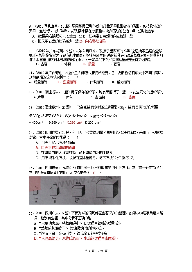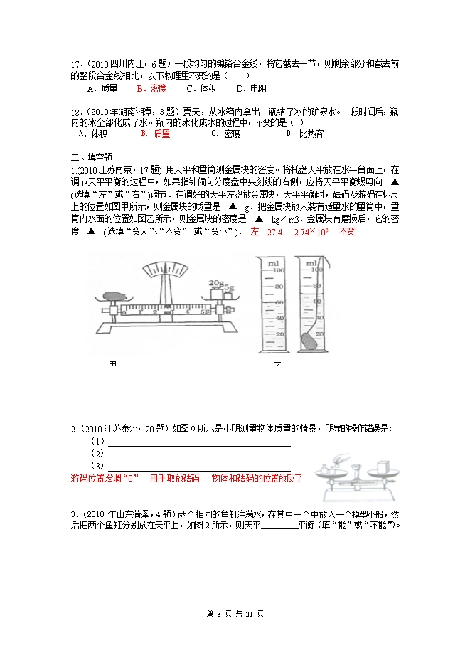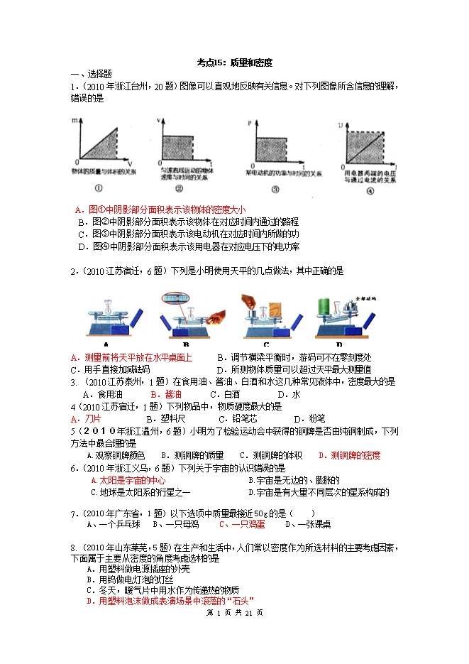 2010中考物理试题分类汇编(93套)专题十五--质量和密度