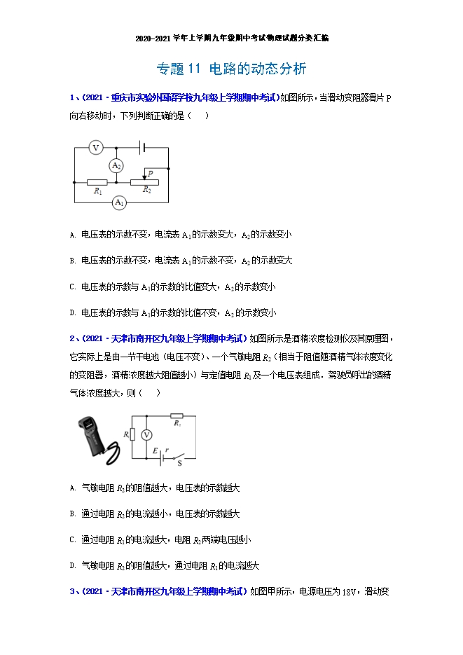 [精品]专题11 电路的动态变化--2020-2021学年上学期九年级期中物理试题分类汇编(原卷版和解析版)