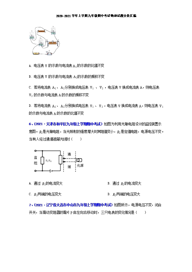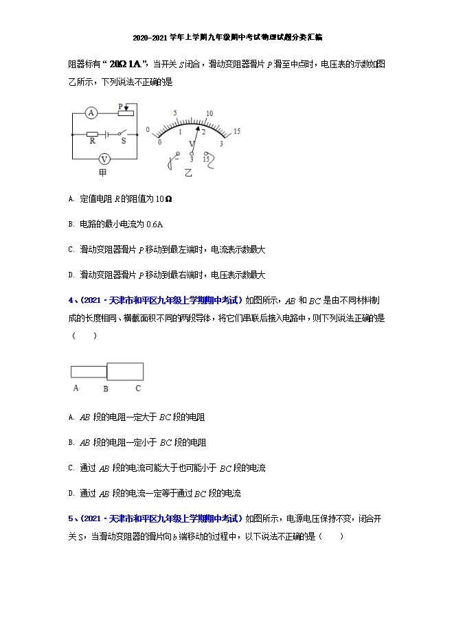 【内容简介】1、(2021•重庆市实验外国语学校九年级上学期期中考试)如图所示,当滑动变阻器滑片P向右移动时,下列判断正确的是( ) A. 电压表的示数不变,电流表A1的示数变大,A2的示数变小B. 电压表的示数不变,电流表A1的示数不变,A2 的示数变大C. 电压表的示数与A1的示数的比值变大,A2的示数变小D. 电压表的示数与A1的示数的比值不变,A2 的示数变小【答案】D【解析】由图示分析可知,两个电阻是并联关系,电压表测电源电压也就是知支路的电压,电流表A1测通过电阻R1的电流,电流表A2测总电流;当滑动变阻器滑片P向右移动时,变阻器的电阻变大,总电阻变大,总电流变小,所以电流A2的示数变小,而电压表和电流表A1都不受影响,示数不变。故选D。2、(2021•天津市南开区九年级上学期期中考试)如图所示是酒精浓度检测仪及其原理图,它实际上是由一节干电池(电压不变)、一个气敏电阻R2(相当于阻值随酒精气体浓度变化的变阻器,酒精浓度越大阻值越小)与定值电阻R1及一个电压表组成.驾驶员呼出的酒精气体浓度越大,则( ) A. 气敏电阻R2的阻值越大,电压表的示数越大B. 通过电阻R2的电流越小,电压表的示数越大C. 通过电阻R1的电流越大,电阻R2两端电压越小D. 气敏电阻R2的阻值越大,通过电阻R1的电流越大【答案】C【解析】由图R1与R2串联,驾驶员呼出的酒精气体浓度越大,气敏电阻R2的阻值越小,电路中总中总电阻变小,由I= ,电源电压一定,总电阻变小,电路中电流变大.根据串联电路中电流处处相等,所以通过R1、R2电流都变大;由U=IR,定值电阻R1两端的电压变大,即电压表示数变大,所以U2=U﹣U1,R1电压变大,R2电压变小.故ABD错误,C正确.3、(2021•天津市南开区九年级上学期期中考试)如图甲所示,电源电压为18V,滑动变阻器标有“ ”,当开关S闭合,滑动变阻器滑片P滑至中点时,电压表的示数如图乙所示,下列说法不正确的是 A. 定值电阻R的阻值为10 B. 电路的最小电流为0.6AC. 滑动变阻器滑片P移动到最左端时,电流表示数最大D. 滑动变阻器滑片P移动到最右端时,电压表示数最大【答案】C【解析】A.电源电压为18V,滑动变阻器滑片P滑至中点时,滑动变阻器阻值为10Ω,刚好分得9V电压,根据串联电路分压定律可得定值电阻R的阻值为10 ,A正确,但不符合题意;B.当滑动变阻器滑片P滑到最右端时,电路电阻最大,电流最小为 B正确,但不符合题意;C.滑动变阻器能承受的最大电流为1A,因此电路最小电阻为 滑动变阻器至少接入 电阻为 当滑动变阻器往左滑动的过程中,接入电阻小于8Ω时,电路电路大于1A,滑动变阻器烧坏,此时电路电流为0A,C错误,但符合题意;D.滑动变阻器滑片P移动到最右端时,滑动变阻器电阻最大,电压表测量滑动变阻器电压,根据串联电路分压原理可知,电压表示数最大,D正确,但不符合题意。故选C。4、(2021•天津市和平区九年级上学期期中考试)如图所示,AB 和 BC 是由不同材料制成的长度相同、横截面积不同的两段导体,将它们串联后接入电路中,则下列说法正确的是( )
