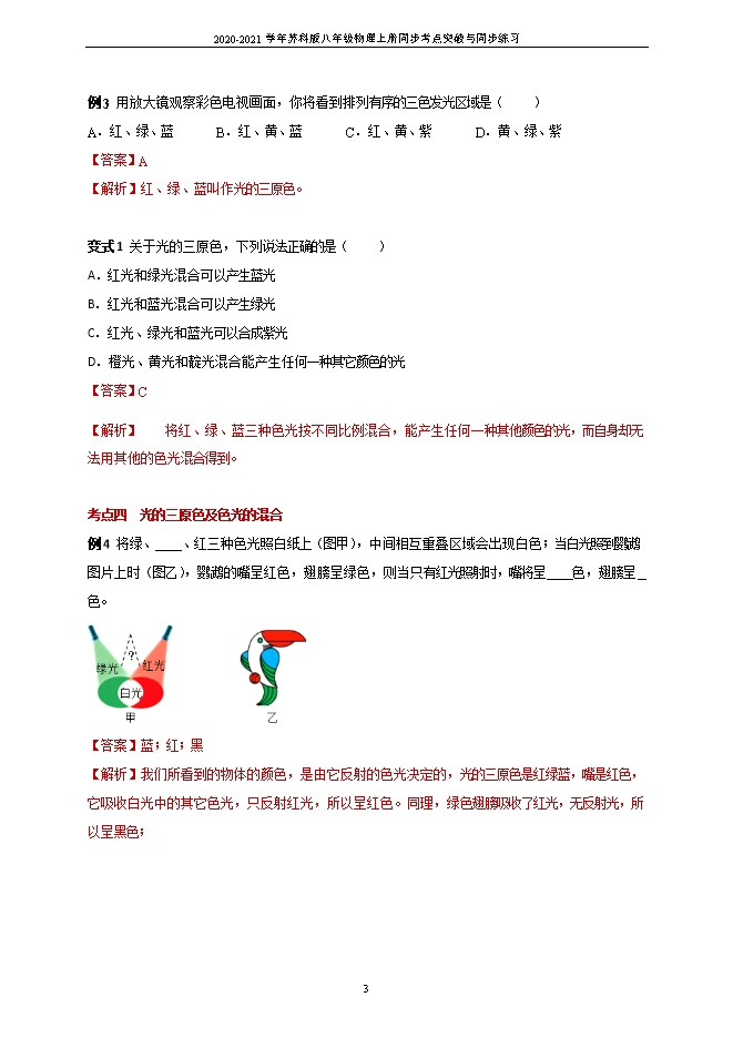 [精品]课时3.1 光的色彩 颜色--2020-2021学年苏科版八年级物理上册同步考点突破与同步练习(附解析)