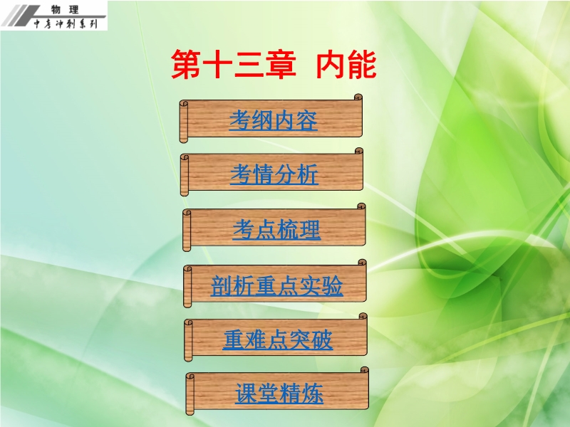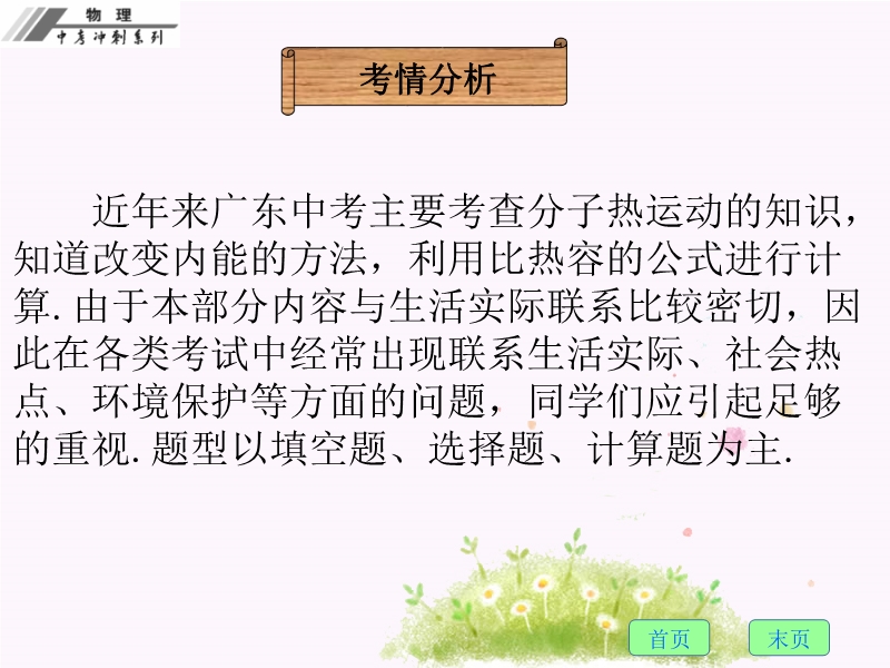 【内容简介】1、诗句“大漠孤烟直,长河落日圆”给我们展现了一幅美丽的画卷。其实诗人观察到的落日并非太阳的实际位置(如图所示),而是太阳光经过不均匀的大气层发生了________所成的像,太阳实际在图中________(填“甲”或“乙”)的位置。解析:略 答案为 折射 乙2、如图所示,起初茶碗看起来是空的,但当你慢慢向碗中倒水时,就会发现碗中原来还藏着一枚硬币,这是光的________现象,看到的硬币是________(填“实物”或“虚像”)。 解析:略 答案为 折射 虚像3、小明在平静的湖边看到“云在水中飘,鱼在云上游”的现象。“云在水中飘”是小明以________为参照物看到“云”在水中运动的现象。“鱼在云上游”是鱼通过水面的________形成的虚像和云在水面的________形成的虚像同时出现的现象。解析:略 答案为 水 折射 反射 4、太阳光通过三棱镜后被分解成了红、橙、黄、绿、蓝、靛、紫几种颜色的光(如图),此实验不仅表明了白光是由各种色光混合而成,而且表明了________光通过棱镜后偏折的程度比其他颜色的光要小。据此可以推断,红光在棱镜中传播速度最________。 解析; 略 答案为 红 快二、选择题5、一盏探照灯的灯光射向水池,如图所示,在没有水的池底C处形成一个光斑。在逐步注水的过程中,B处的人看到池底的光斑会( ) A. 在原地不动 B. 先向左移再向右移 C. 向左移动 D. 向右移动 解析:在没有注水时,根据光的直线传播,人直接能看到C点;当注水后,探照灯射出的光线到水面发生折射,折射光线靠拢法线照射到C′点,人看C′点时,C′点射出的光线到水面再次发生折射,折射光线远离法线进入人眼,眼睛逆着光线看,感觉光线是从C″射出的,所以人看到光斑向右移动。 6、人在水面下看到岸边景物的正确光路是( ) 解析:人在水面下光线的方向由空气进入水,还要考虑光由空气进入水时折射角小于入射角,所以答案为C。7、“新冠肺炎”疫情期间,我们经常使用一种叫“测温枪”的测温仪器,只要把“枪口”对准人的额头或手腕,“枪尾”的显示屏就能用数字直接报告人体的温度,测温枪测温利用的是( ) A. 红外线 B. 紫外线 C. 红光 D. 紫光解析;红外线具有热效应,所以答案为A。