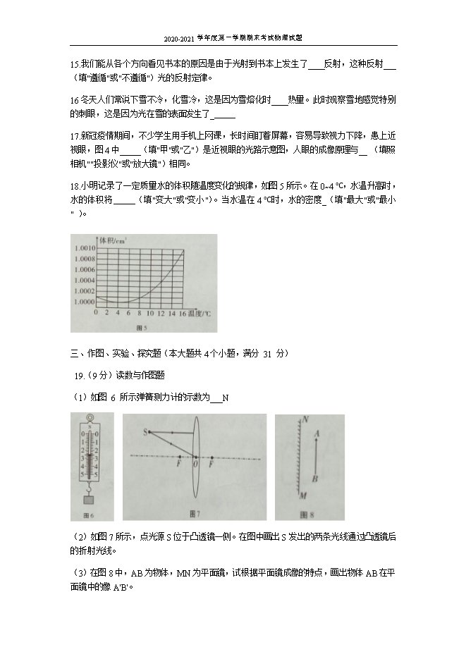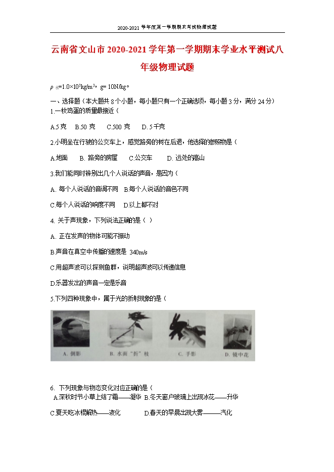 云南省文山市2020-2021学年第一学期期末学业水平测试八年级物理试题(含答案)