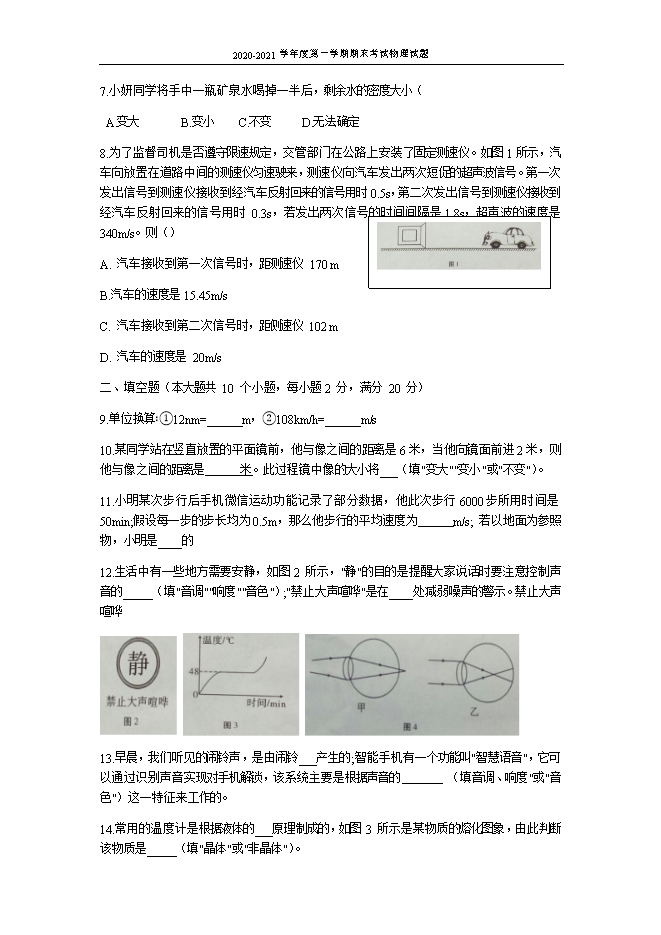 【内容简介】ρ水=1.0×103kg/m3,g= 10N/kg。一、选择题(本大题共8个小题,每小题只有一个正确选项,每小题3分,满分24分) 1.一枚鸡蛋的质量最接近(A.5克 B.50 克 C.500 克 D. 5千克2.小明坐在行驶的公交车上,感觉路旁的树在后退,他选择的参照物是(A.地面 B. 路旁的房屋 C.公交车 D. 远处的高山3.我们能同时辨别出几个人说话的声音,是因为(A. 每个人说话的音调不同 B.每个人说话的音色不同C.每个人说话的响度不同 D.以上都不对4. 关于声现象,下列说法正确的是( )A. 正在发声的物体可能不振动 B.声音在真空中传播的速度是 340m/sC.用超声波可以探测鱼群,说明超声波可以传递信息 D.乐器发出的声音一定是乐音5.下列四种现象中,属于光的折射现象的是( 6.下列现象与物态变化对应正确的是( A.深秋时节小草上结了霜——凝华 B.冬天窗户玻璃上出现冰花——升华C.夏天吃冰棍解热——液化 D.春天的早晨出现大雾———汽化 7.小妍同学将手中一瓶矿泉水喝掉一半后,剩余水的密度大小( A.变大 B.变小 C.不变 D.无法确定8.为了监督司机是否遵守限速规定,交管部门在公路上安装了固定测速仪。如图1所示,汽车向放置在道路中间的测速仪匀速驶来,测速仪向汽车发出两次短促的超声波信号。第一次发出信号到测速仪接收到经汽车反射回来的信号用时0.5s,第二次发出信号到测速仪接收到经汽车反射回来的信号用时 0.3s,若发出两次信号的时间间隔是1.8s,超声波的速度是 340m/s。则() A. 汽车接收到第一次信号时,距测速仪 170 m B.汽车的速度是15.45m/sC. 汽车接收到第二次信号时,距侧速仪 102 mD. 汽车的速度是 20m/s二、填空题(本大题共 10 个小题,每小题2 分,满分 20 分) 9.单位换算∶①12nm=______m,②108km/h=______m/s10.某同学站在竖直放置的平面镜前,他与像之间的距离是6米,当他向镜面前进2米,则他与像之间的距离是 米。此过程镜中像的大小将___(填"变大""变小"或"不变")。11.小明某次步行后手机微信运动功能记录了部分数据,他此次步行6000步所用时间是50min;假设每一步的步长均为0.5m,那么他步行的平均速度为 m/s; 若以地面为参照物,小明是____的12.生活中有一些地方需要安静,如图2 所示,"静"的目的是提醒大家说话时要注意控制声音的_____(填"音调""响度""音色");"禁止大声喧哗"是在____处减弱噪声的警示。禁止大声喧哗