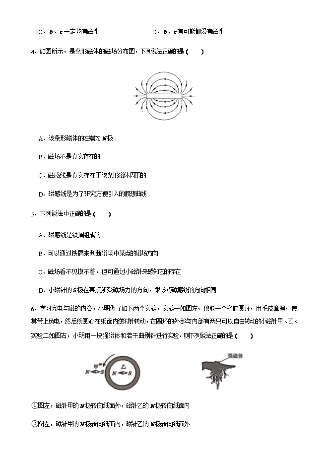 【内容简介】易错点一 物体是否具有磁性的判断方法1.实验室有一根钢棒,下列做法叙述中,能确定钢棒具有磁性的有 ①用该钢棒去吸引磁铁,能吸引②将该钢棒中点系上细线,悬挂起来,拨动钢棒,发现最后总是指向南北③用该钢棒去吸引小铁钉,能吸引④将钢棒与一个强磁体放在一起,一段时间后,发现钢棒也有磁性A.①②B.②③C.①③D.②④【解析】①用该钢棒去吸引磁铁,即使钢棒没有磁性,条形磁体也会吸引钢棒,所以不能确定钢棒是否具有磁性;②磁体由于受到地磁场的作用,当其自由静止时,要指向南北方向,因此,将该钢棒中点系上细线悬挂起来,拨动钢棒,发现最后总是指向南北,可以确定钢棒具有磁性;③用该钢棒去吸引小铁钉,能吸引,根据磁体可以吸引磁性物质的特性可知,可以确定钢棒具有磁性;④将钢棒与一个强磁体放在一起,一段时间后,发现钢棒也有磁性,也许其一开始就有磁性,只是后来磁性更强了,故不能确定钢棒是否具有磁性。综上所述,②③的做法可以确定钢棒具有磁性。故选: 。2.为了判断一根铁棒是否具有磁性,小明提出了如下四个实验方案,可行的方案是 3. A.甲图中,将悬挂的铁棒转动一次,静止时指向南、北B.乙图中,将铁棒一端靠近小磁针,相互吸引C.丙图中,将铁棒一端靠近大头针,大头针被吸引D.丁图中,将铁棒一端靠近验电器,验电器铝箔片没有张开【解析】 、甲图中,将悬挂的铁棒转动一次,静止时指向南、北,具有偶然性,故 不可行; 、将铁棒一端靠近小磁针,即使铁棒没有磁性,小磁针也会吸引铁棒,故 方法不可行; 、铁棒能够吸引大头针,说明了铁棒具有磁体才具有的性质:能够吸引铁钴镍等物质,即铁棒有磁性,故 方法可行; 、验电器可以检验物体是否带电,但不能判断物体是否具有磁性,故 方法不可行。故选: 。3.现有 、 、 三根铁棒,为确定铁棒是否有磁性,将三根铁棒如图所示悬挂,在三根铁棒悬挂前,根据图示情况可得 A. 、 一定均有磁性B. 、 有可能都没有磁性C. 、 一定均有磁性D. 、 有可能都没有磁性【解析】根据三棒的平衡态进行受力分析可知, 、 棒都有水平向右的力,所以 有磁性;再分析 、 可知之间存在斥力,所以判断 有磁性,所以无磁性的只有 ,故 正确, 错误。故选: 。4.如图所示,是条形磁体的磁场分布图,下列说法正确的是