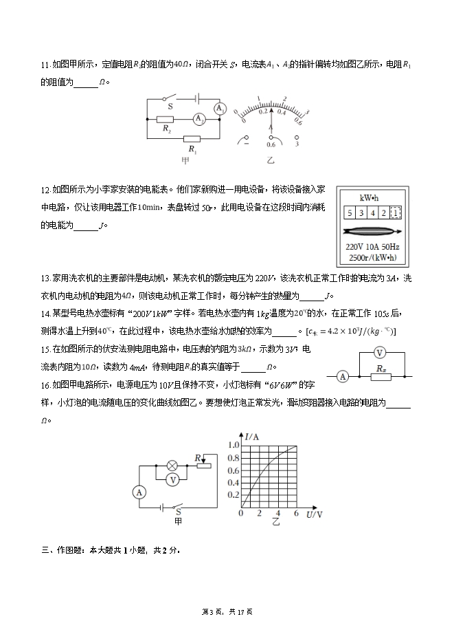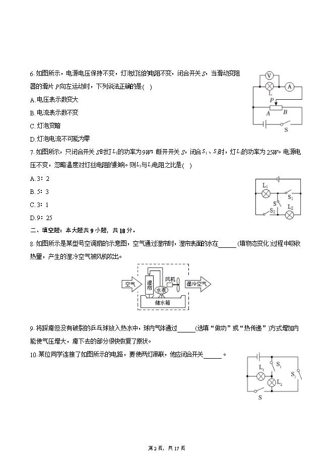 【内容简介】1.关于温度、热量和内能的说法中正确的是( )A. 温度高的物体,含有的热量多B. 物体的内能增加,一定从外界吸收了热量C. 热传递过程中,热量由内能大的物体传向内能小的物体D. 一块0℃的冰熔化成0℃的水后,温度不变,内能变大2.小亮将两只相同的气球在自己的头发上摩擦后,就可以让一只气球在另一只气球上方“跳舞”(如图)。对该现象解释正确的是( )A. 摩擦的方法创造了电荷使两气球带了电 B. 摩擦的方法使气球分子发生转移而带电C. 这种现象与验电器的工作原理相同 D. 两气球因带了异种电荷而互相排斥3.下列关于电学中的概念说法正确的是( )A. 有电压就一定有电流 B. 电流越大,电阻越大C. 电流做功时间越短,电功率越大 D. 单位时间内电流做功越多,电功率越大4.如图所示,体温安检门是一种集人体温度检测和金属探测为一体的安全检测门,门头装有高精度的体温检测探头,能够测量人体额头的温度,门中建立有电磁场,能够探测人体是否携带金属物品。当人体温度过高(S_1闭合)或人身上携带金属物品(S_2闭合)时,报警指示灯就会亮起且仪器发出报警声。下面的简化电路图符合要求的是( )