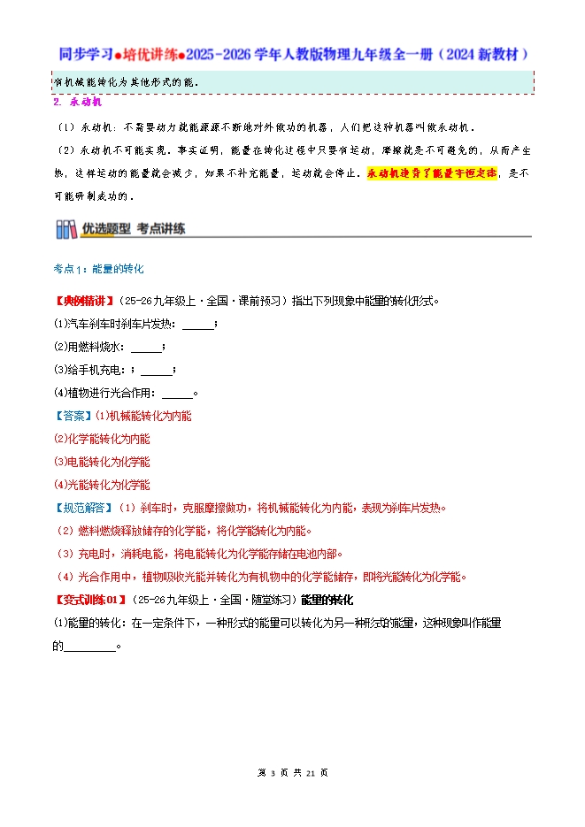 【内容简介】知识点梳理02: 能量守恒定律1. 能量守恒定律(1)能量守恒定律内容:能量既不会消灭,也不会产生,它只会从一种形式转化为另一种形式,或者从一个物体转移到另一个物体,而在转化和转移过程中,能量的总量保持不变。(2)对能量守恒定律的理解①能量守恒定律是自然界最重要、最普遍的基本定律。大到天体,小到原子核,无论是物理学问题还是化学、生物学、地理学、天文学的问题,所有能量转化的过程,都遵从能量守恒定律。②能量守恒定律包括“能量转化”和“能量转移”两个方面。 机械能守恒和能量守恒的区别与联系能量守恒是无条件的,机械能守恒有条件。机械能守恒的条件是在只有重力(或弹力)做功的情形下,物体的重力势能(或弹性势能)和动能发生相互转化,没有其他形式的能转化为机械能,也没有机械能转化为其他形式的能。2. 永动机(1)永动机:不需要动力就能源源不断地对外做功的机器,人们把这种机器叫做永动机。(2)永动机不可能实现。事实证明,能量在转化过程中只要有运动,摩擦就是不可避免的,从而产生热,这样运动的能量就会减少,如果不补充能量,运动就会停止。永动机违背了能量守恒定律,是不可能研制成功的。