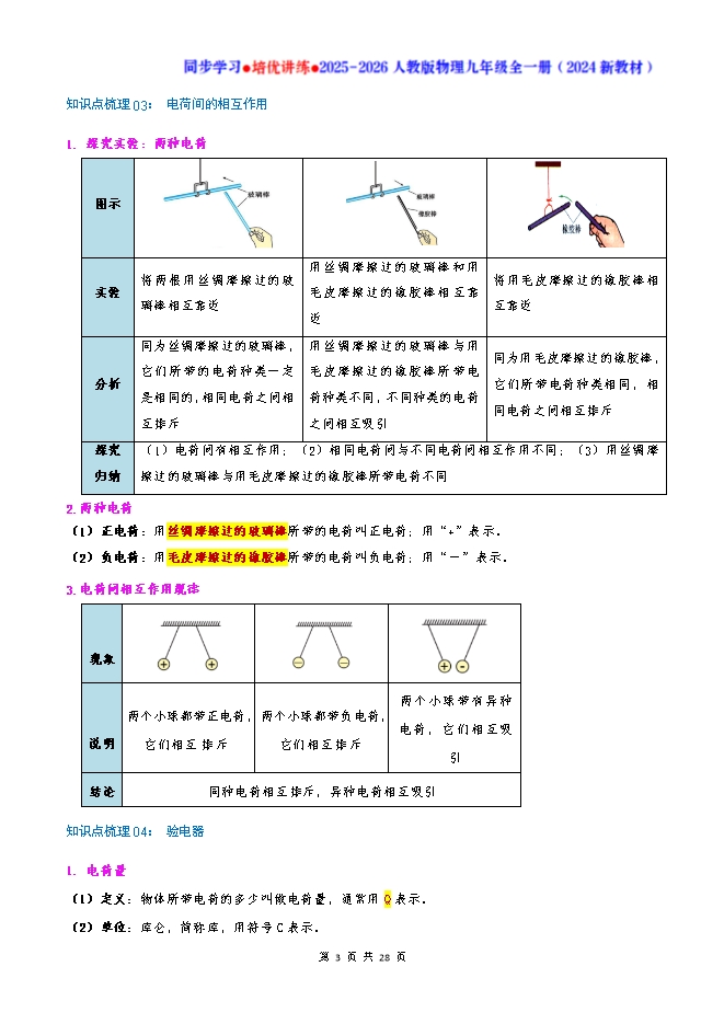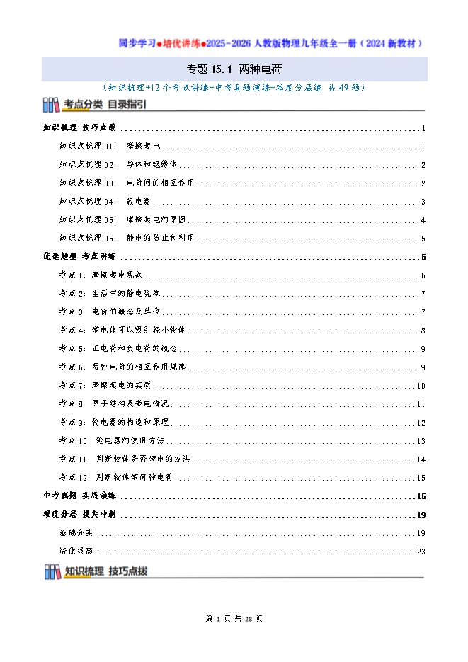 专题15.1 两种电荷--2025-2026人教版物理九年级全一册同步学习 培优讲练:知识梳理+考点讲练+中考真题演练+难度分层(试题版和答案版)