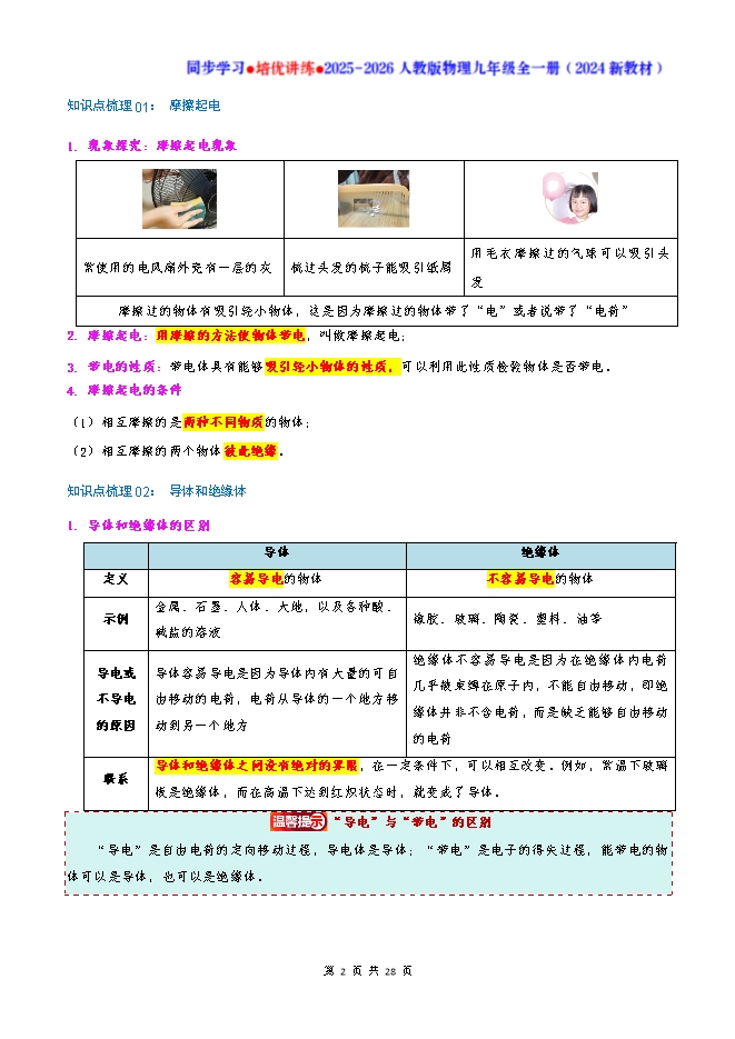 【内容简介】知识点梳理01: 摩擦起电1. 现象探究:摩擦起电现象 常使用的电风扇外壳有一层的灰 梳过头发的梳子能吸引纸屑 用毛衣摩擦过的气球可以吸引头发摩擦过的物体有吸引轻小物体,这是因为摩擦过的物体带了“电”或者说带了“电荷”2. 摩擦起电:用摩擦的方法使物体带电,叫做摩擦起电; 3. 带电的性质:带电体具有能够吸引轻小物体的性质,可以利用此性质检验物体是否带电。4. 摩擦起电的条件(1)相互摩擦的是两种不同物质的物体;(2)相互摩擦的两个物体彼此绝缘。知识点梳理02: 导体和绝缘体1. 导体和绝缘体的区别导体 绝缘体定义 容易导电的物体 不容易导电的物体示例 金属、石墨、人体、大地,以及各种酸、碱盐的溶液 橡胶、玻璃、陶瓷、塑料、油等导电或不导电的原因 导体容易导电是因为导体内有大量的可自由移动的电荷,电荷从导体的一个地方移动到另一个地方 绝缘体不容易导电是因为在绝缘体内电荷几乎被束缚在原子内,不能自由移动,即绝缘体并非不含电荷,而是缺乏能够自由移动的电荷联系 导体和绝缘体之间没有绝对的界限,在一定条件下,可以相互改变。例如,常温下玻璃板是绝缘体,而在高温下达到红炽状态时,就变成了导体。 “导电”与“带电”的区别“导电”是自由电荷的定向移动过程,导电体是导体;“带电”是电子的得失过程,能带电的物体可以是导体,也可以是绝缘体。