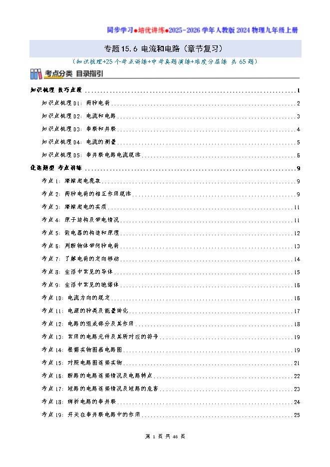 - 171专题15.3 串联电路和并联电路--2025-2026人教版物理九年级全一册同步学习 培优讲练:知识梳理+…
