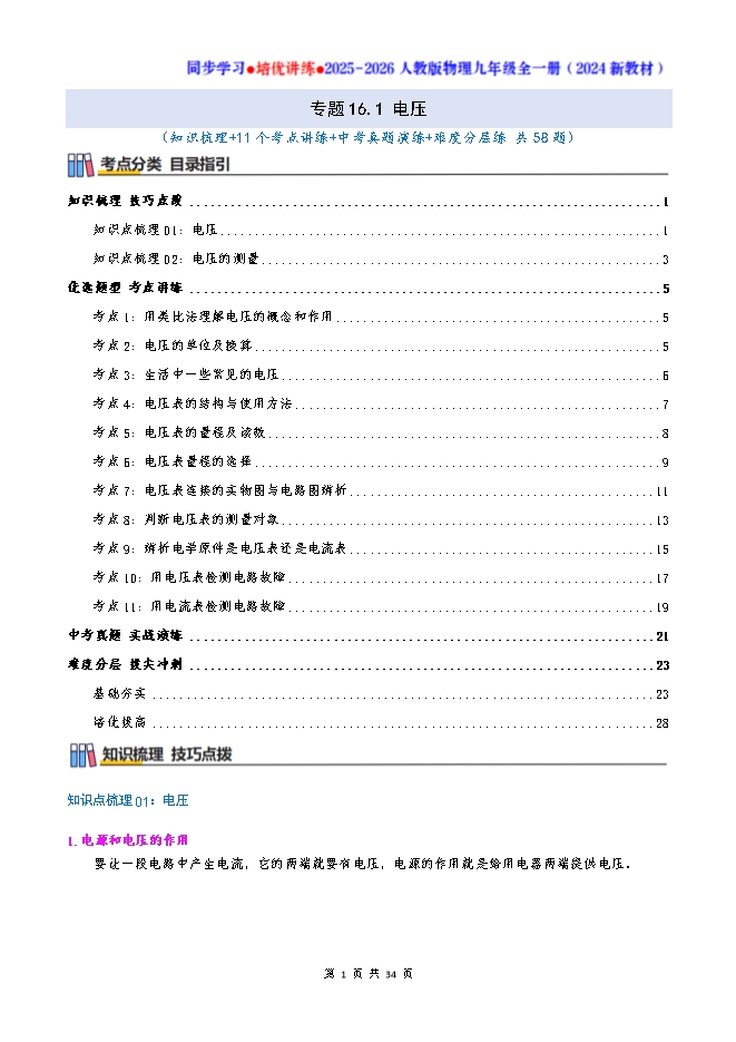 专题16.1 电压--2025-2026人教版物理九年级全一册同步学习 培优讲练:知识梳理+考点讲练+中考真题演练+难度分层(试题版和答案版)
