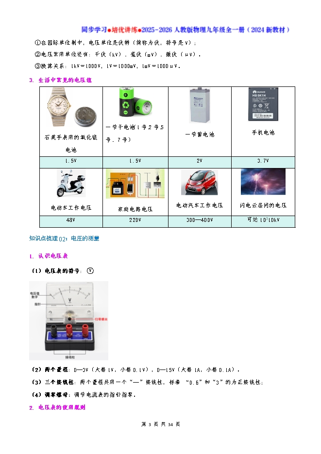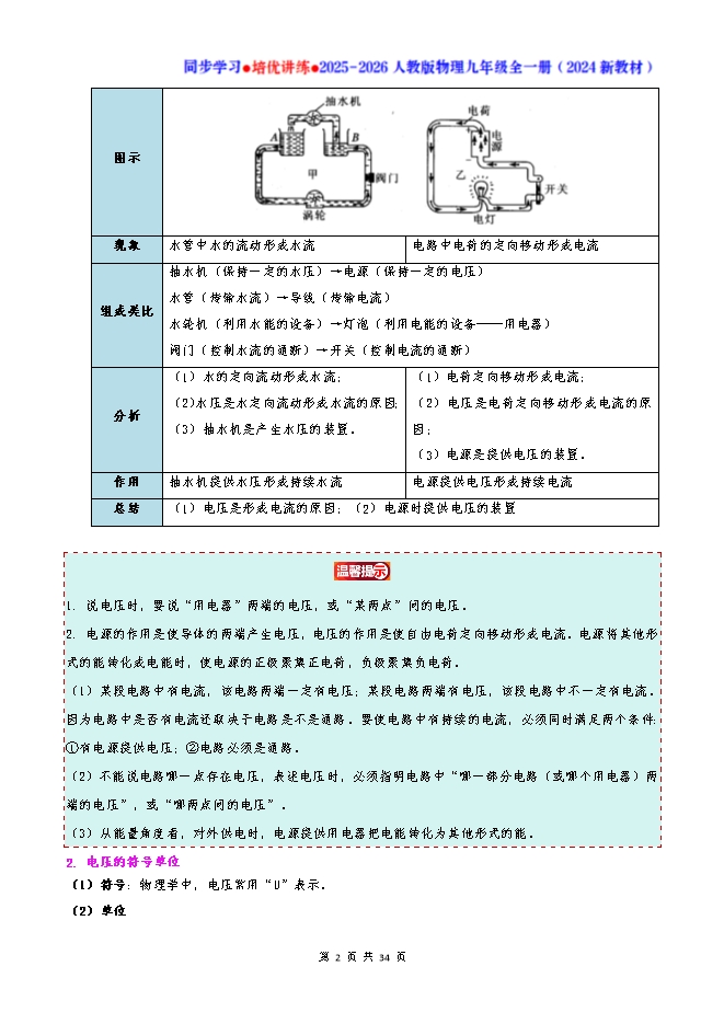 【内容简介】知识点梳理01:电压1.电源和电压的作用要让一段电路中产生电流,它的两端就要有电压,电源的作用就是给用电器两端提供电压。图示 现象 水管中水的流动形成水流 电路中电荷的定向移动形成电流组成类比 抽水机(保持一定的水压)→电源(保持一定的电压)水管(传输水流)→导线(传输电流)水轮机(利用水能的设备)→灯泡(利用电能的设备——用电器)阀门(控制水流的通断)→开关(控制电流的通断)分析 (1)水的定向流动形成水流;(2)水压是水定向流动形成水流的原因;(3)抽水机是产生水压的装置。 (1)电荷定向移动形成电流;(2)电压是电荷定向移动形成电流的原因;(3)电源是提供电压的装置。作用 抽水机提供水压形成持续水流 电源提供电压形成持续电流总结 (1)电压是形成电流的原因;(2)电源时提供电压的装置 1. 说电压时,要说“用电器”两端的电压,或“某两点”间的电压。2. 电源的作用是使导体的两端产生电压,电压的作用是使自由电荷定向移动形成电流。电源将其他形式的能转化成电能时,使电源的正极聚集正电荷,负极聚集负电荷。(1)某段电路中有电流,该电路两端一定有电压;某段电路两端有电压,该段电路中不一定有电流。因为电路中是否有电流还取决于电路是不是通路。要使电路中有持续的电流,必须同时满足两个条件: ①有电源提供电压;②电路必须是通路。(2)不能说电路哪一点存在电压,表述电压时,必须指明电路中“哪一部分电路(或哪个用电器)两端的电压”,或“哪两点间的电压”。(3)从能量角度看,对外供电时,电源提供用电器把电能转化为其他形式的能。2. 电压的符号单位(1)符号:物理学中,电压常用“U”表示。(2)单位