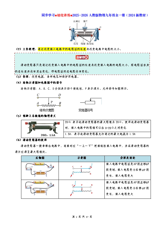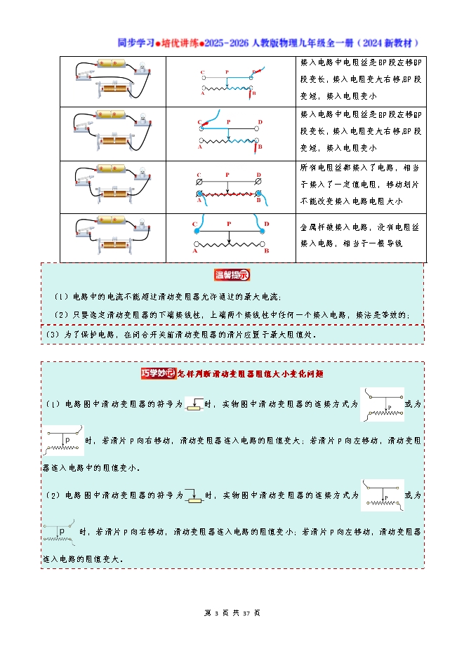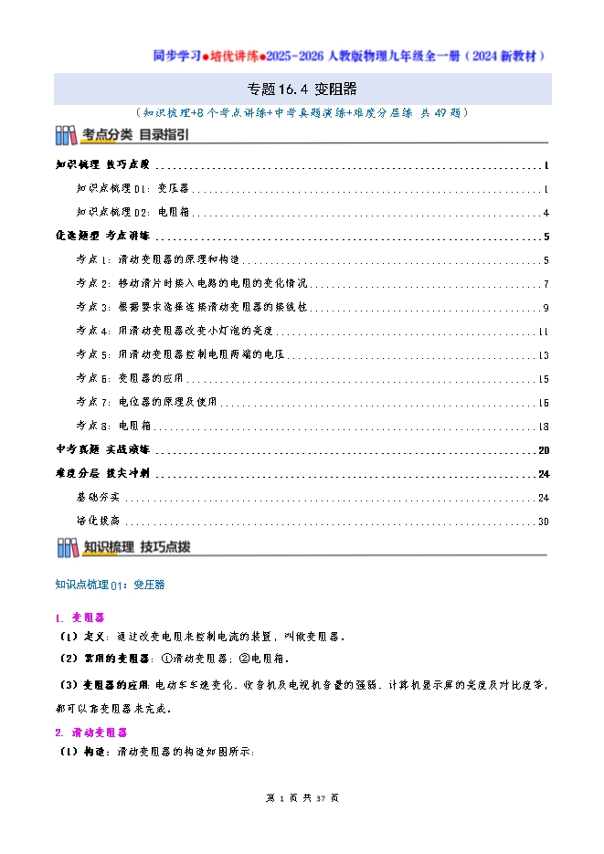 专题16.4 变阻器--2025-2026人教版物理九年级全一册同步学习 培优讲练:知识梳理+考点讲练+中考真题演练+难度分层(试题版和答案版)