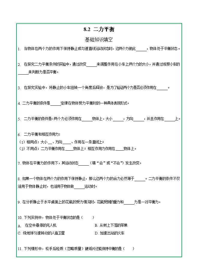 【内容简介】第八章 第二节 二力平衡—2025-2026学年人教版物理八年级下学期预习基础知识填空(附答案)