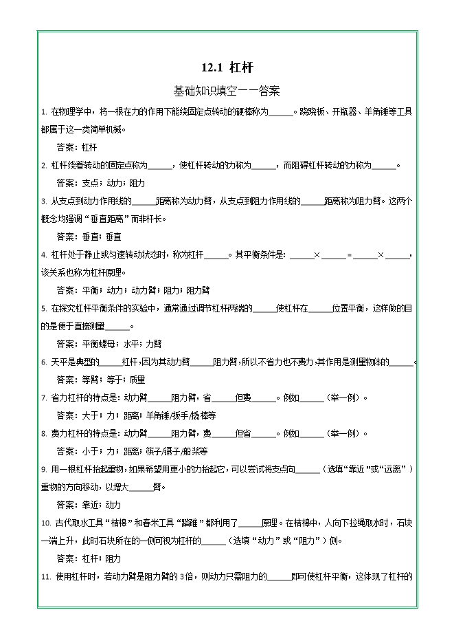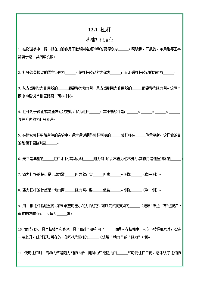 【内容简介】第十二章 第一节 杠杆—2025-2026学年人教版物理八年级下学期预习基础知识填空(附答案)