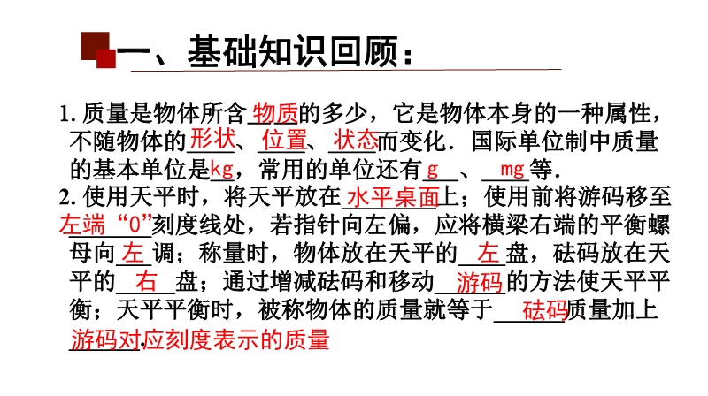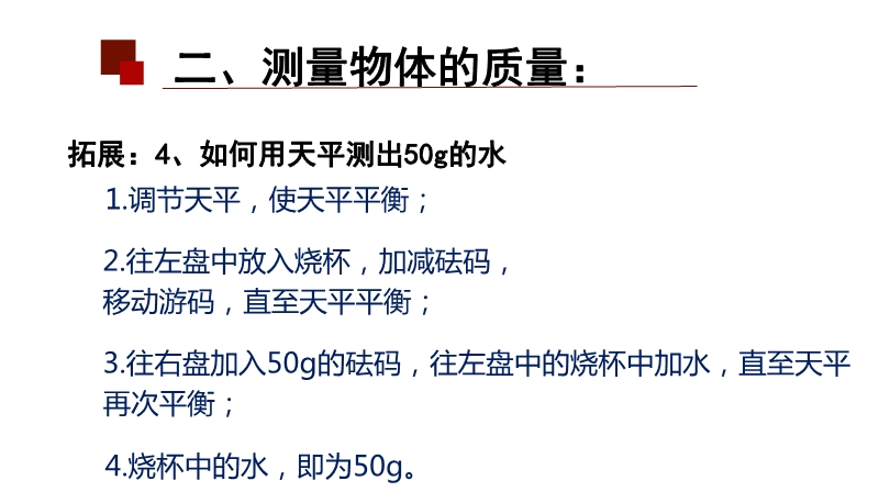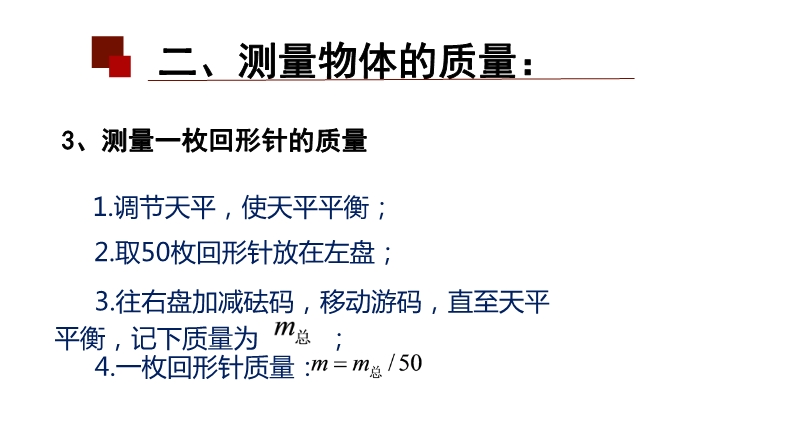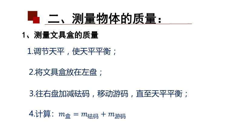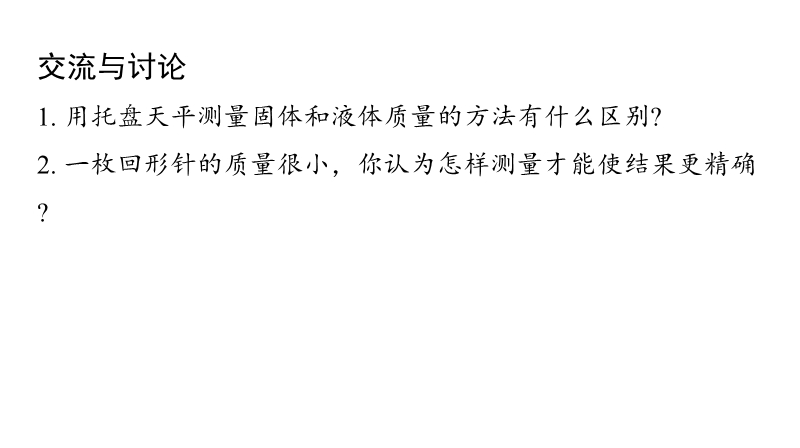 【内容简介】该初中物理课件聚焦“质量及其测量”第二课时,核心内容涵盖质量的物理观念巩固(质量是物体属性)及测量技能(固体、液体常规测量,微小物体积累法测量),通过基础知识回顾搭建学习支架,引导学生从天平使用规范过渡到实际测量操作,形成“回顾—实验—应用”的认知脉络。其亮点在于以科学探究为主线,设计分层实验任务(测文具盒、水、回形针质量),通过对比固体与液体测量方法差异、讨论微小物体测量精度等环节,培养科学思维中的模型建构与科学推理能力,强化物理观念的应用。练习结合生活实例(如邮票质量测量),既巩固积累法等科学方法,又提升问题解决能力,教师可借助结构化实验设计与分层练习,高效落实核心素养培养目标。