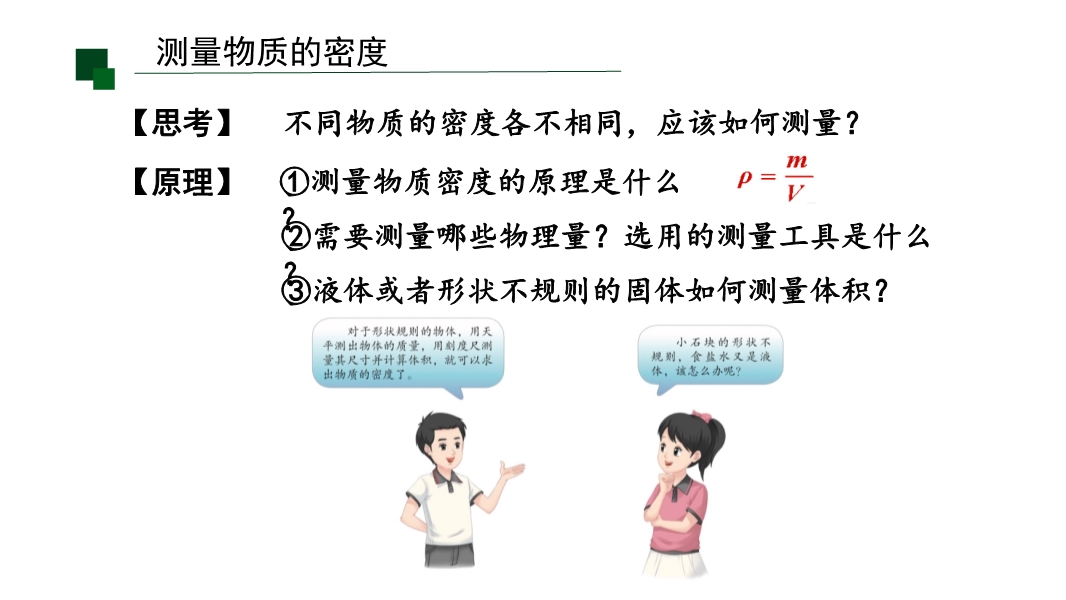 【内容简介】该初中物理课件聚焦“密度知识的应用”,系统涵盖测量固体(如小石块、蜡块)和液体(如食盐水)密度的实验方法、鉴别物质及间接测量物体质量或体积等核心内容。课堂导入通过“知识回顾”梳理密度定义、公式等旧知,结合“思考”提问如何测量不同物质密度,搭建从已有认知到新知探究的学习支架,引导学生逐步深入。其亮点在于以科学探究为核心,通过固体密度测量中的排水法步骤规范、蜡块漂浮的针压/助沉法创新,液体密度测量中方案A(烧杯残留误差)与方案B(改进步骤减误差)的对比分析,培养学生科学思维中的科学论证与质疑创新能力。融入阿基米德鉴别王冠、牛奶密度检测等生活实例,渗透科学态度与责任中的社会责任意识,结构化小结明确密度应用三方面,助力学生构建物理观念中的物质观念,既帮助学生掌握实验技能与问题解决方法,也为教师开展高效实验教学提供清晰路径。