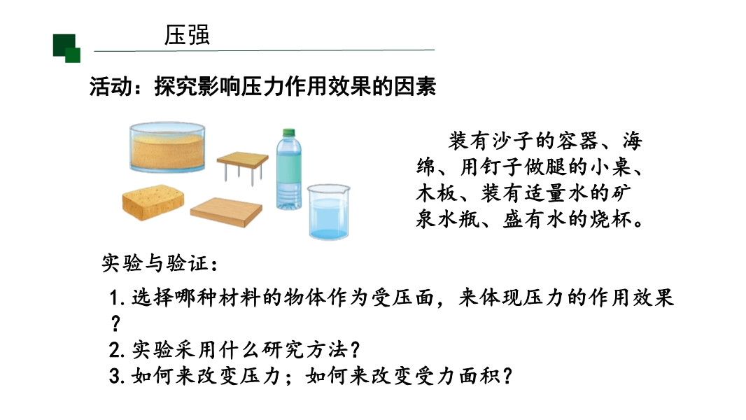 【内容简介】课件聚焦“压强”核心知识点,以“钉床实验”导入激发兴趣,通过观察作图活动建立压力概念,再经探究实验(体验猜想、器材选择、方案设计)分析压力作用效果影响因素,最终引出压强定义、公式及单位,构建从现象到概念的学习支架。其亮点在于融合科学探究与科学思维,探究实验采用控制变量法,用海绵、沙子等材料直观呈现效果,通过计算压力与面积比值(如10N/2m²、20N/3m²)引出压强定义,体现科学推理。小结系统梳理压力、影响因素及压强三要素,助力学生构建物理观念,既提升学生探究能力,也为教师提供清晰教学脉络与实践素材。