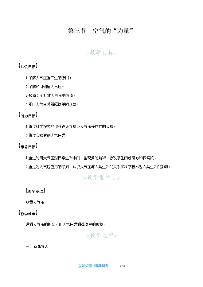 - 3658.3 空气的“力量”--2024新沪科版物理八年级下学期科学素养新教学设计(附教学反思)