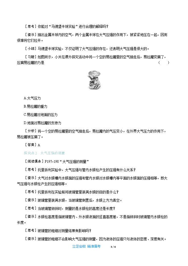 【内容简介】一、新课导入将一个煮熟的鸡蛋,剥去外壳,放置在一个瓶口小于鸡蛋的瓶子上,你有办法让瓶子把鸡蛋整个吞下去吗? 二、教学步骤探究点1 大气压强[阅读课本]P195~196“大气压强”[思考]将薄片平放在空的杯口,用手按住,并倒置过来,放手后,会看到什么现象?你能说出其中的原因吗?[提示]薄片在重力的作用下,掉了下来。[思考]将杯子装满水,仍用薄片盖住杯口,用手按住,并倒置过来,会出现什么现象?你能解释其中的原因吗?[提示]薄片没有掉下,托住了一杯水。说明一定有一个肉眼看不见的物体在托住薄片。[思考]这个看不见的物体可能是什么?[提示]与薄片接触的只有空气,所以一定是空气对薄片施加了力的作用。[思考]这个实验能说明什么?[提示]说明大气也会产生压强。[思考]取两个挂物品的小吸盘,按图8⁃34对接,挤出吸盘内部的空气,双手向两侧拉吸盘,出现了什么现象?若让外部空气进入吸盘内部呢,为什么会出现这样的现象?[提示]若要拉开对接排出空气后的吸盘,则需较大的力;若让外部空气进入吸盘内部,则能轻松分开吸盘。这是因为吸盘内部空气排出后,吸盘外部的空气会把两个吸盘紧压在一起,所以需要较大外力才能将其拉开。如果空气能进入吸盘内部,吸盘内、外所受的大气压强逐渐变为相同大小,那么就能轻松分开吸盘。[思考]在覆杯实验的基础上,进一步转动杯子,让杯口朝不同方向,薄片会掉下吗?这一现象说明了什么?