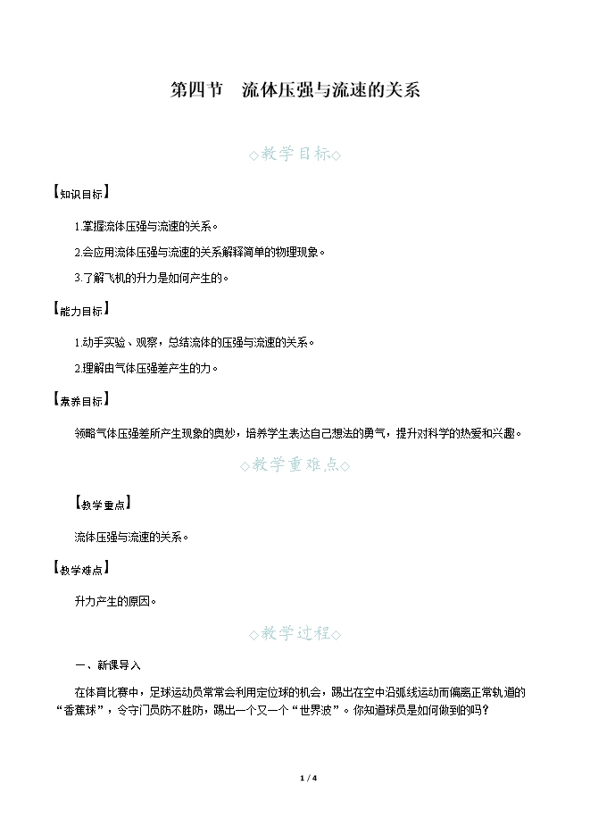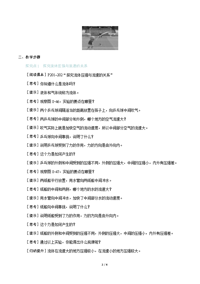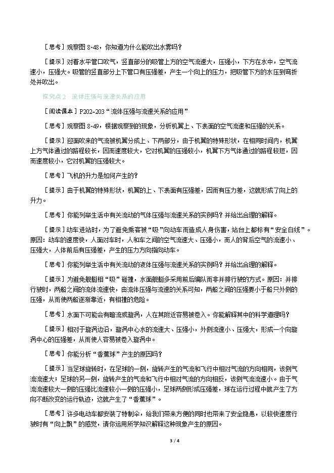 【内容简介】一、新课导入在体育比赛中,足球运动员常常会利用定位球的机会,踢出在空中沿弧线运动而偏离正常轨道的“香蕉球”,令守门员防不胜防,踢出一个又一个“世界波”。你知道球员是如何做到的吗? 二、教学步骤探究点1 探究流体压强与流速的关系[阅读课本]P201~202“探究流体压强与流速的关系”[思考]你知道什么是流体吗?[提示]液体和气体统称为流体。[思考]观察图8⁃46,实验的要点在哪里?[提示]两个乒乓球间隔适当的距离放置在筷子上,向乒乓球中间吹气。[思考]两乒乓球的中间部分和外侧,哪个地方的空气流速大?[提示]吹气实际上就是加快空气的流动速度,所以中间部分空气的流速大。[思考]乒乓球向中间靠拢,说明了什么?[提示]说明乒乓球受到了力的作用,力的方向是由外向内。[思考]这个力是如何产生的?[提示]乒乓球的外侧和中间受到的压强不同,外侧的压强大,中间的压强小,内外有压强差。[思考]观察图8⁃47,实验的要点在哪里?[提示]两纸船平行放置,用水管向两纸船中间冲水。[思考]纸船的中间和两侧,哪个地方的水的流速大?[提示]用水管向中间冲水,加快了中间部分水的流动速度。