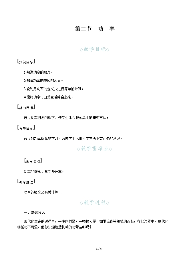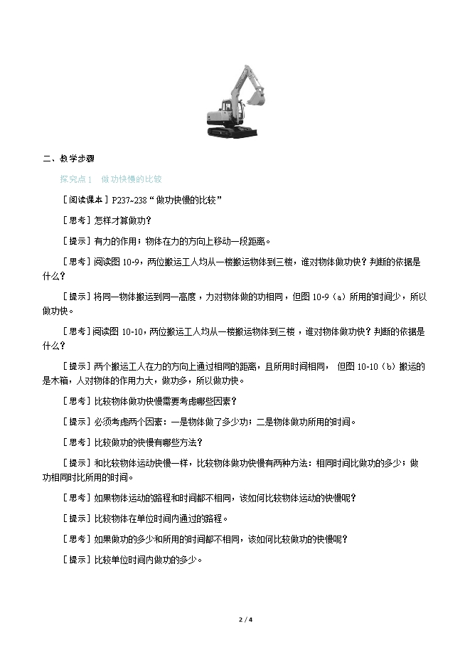 【内容简介】一、新课导入现代化建设的过程中,一座座桥梁,一幢幢大厦,如雨后春笋般拔地而起,在此过程中,现代化机械功不可没,但你知道这些机械的功劳在哪吗? 二、教学步骤探究点1 做功快慢的比较[阅读课本]P237~238“做功快慢的比较”[思考]怎样才算做功?[提示]有力的作用;物体在力的方向上移动一段距离。[思考]阅读图10⁃9,两位搬运工人均从一楼搬运物体到三楼,谁对物体做功快?判断的依据是什么?[提示]将同一物体搬运到同一高度,力对物体做的功相同,但图10⁃9(a)所用的时间少,所以做功快。[思考]阅读图10⁃10,两位搬运工人均从一楼搬运物体到三楼,谁对物体做功快?判断的依据是什么?[提示]两个搬运工人在力的方向上通过相同的距离,且所用时间相同,但图10⁃10(b)搬运的是木箱,人对物体的作用力大,做功多,所以做功快。[思考]比较物体做功快慢需要考虑哪些因素?[提示]必须考虑两个因素:一是物体做了多少功;二是物体做功所用的时间。[思考]比较做功的快慢有哪些方法?[提示]和比较物体运动快慢一样,比较物体做功快慢有两种方法:相同时间比做功的多少;做功相同时比所用的时间。[思考]如果物体运动的路程和时间都不相同,该如何比较物体运动的快慢呢?