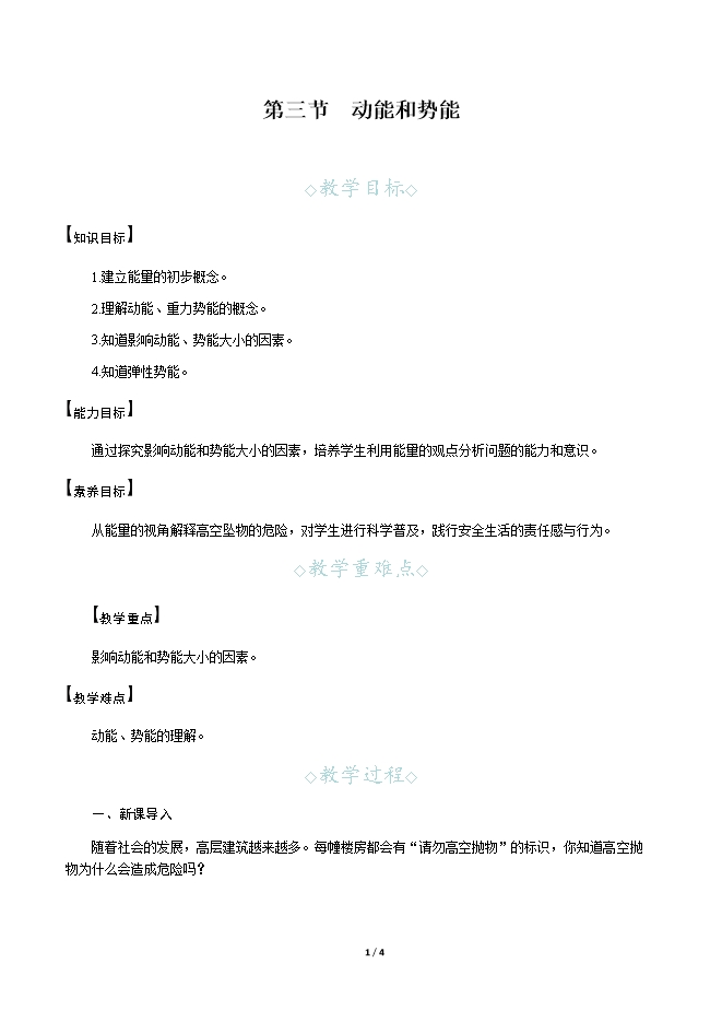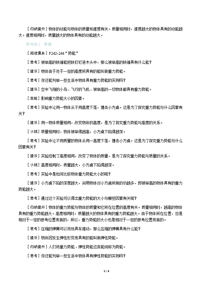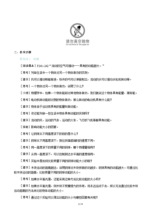 【内容简介】一、新课导入随着社会的发展,高层建筑越来越多。每幢楼房都会有“请勿高空抛物”的标识,你知道高空抛物为什么会造成危险吗?二、教学步骤探究点1 动能[阅读课本]P241~242“流动的空气可推动……具有的动能越大。”[思考]列举生活中一个物体对另一个物体做功的实例。[提示]风可以推动帆船前进,张开的弓可以使箭射出,流动的水可以推动水轮机转动等。[思考]一个物体对另一个物体做功,说明了什么?[小结]物理学中,如果一个物体能够对其他物体做功,我们就说这个物体具有能量,简称能。[思考]电动机转动能够对别的物体做功,那么转动的电动机具有什么能?[提示]物体由于运动而具有的能量叫做动能。[思考]你还能列举一些生活中物体具有动能的实例吗?[提示]流动的风、运动的汽车、运动的火车、飞行的飞机等都具有动能。[实验]影响动能大小的因素。[思考]让钢球从不同高度滚下的目的是什么?[提示]钢球从不同高度滚下,到达斜面底端时的速度不同。[思考]同一高度滚下的质量不同的钢球,哪个物理量相同?[提示]从同一高度滚下,可以控制到达水平面的速度相同。