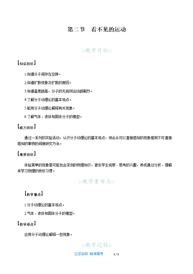 【内容简介】一、新课导入“酒香不怕巷子深”的意思就是说如果酒酿得好,即使是在很深的巷子里,也会有人闻到香味,慕名前来品尝。你知道人们为什么能闻到酒的香味吗? 二、教学步骤探究点1 分子在不断地运动[阅读课本]P284~285“人类有嗅觉……做无规则运动。”[思考]打开香水瓶盖,为什么能闻到香味?这说明什么?[提示]香水分子进入我们的鼻孔,说明了气体的分子在运动。[思考]观察图12⁃13,将装有空气的玻璃瓶瓶口对准装有二氧化氮气体的玻璃瓶瓶口,抽去中间的玻璃板,观察装有空气的玻璃瓶中气体颜色的变化。[提示]装有空气的玻璃瓶中气体逐渐呈红棕色。[思考]观察图12⁃14,几滴蓝墨水为什么会使整杯水变蓝?说明了什么?[提示]蓝墨水的分子运动到了容器中的各个地方,说明液体的分子在运动。[思考]光滑的金块和铅块紧压在一起,长时间放置后发现金块里渗有铅,铅块里也渗有金。这又说明了什么?[提示]说明固体的分子也在运动。[思考]通过以上实验可以得出什么结论?[小结]这些现象说明物质中的分子在永不停息地做无规则运动。[归纳提升]物理学中,将不同的物质互相接触时,会彼此进入对方的现象称为扩散。它是说明分子无规则运动的一个有力证据。[思考]分别在盛有冷水和热水的烧杯中,各滴入几滴墨水,会观察到什么现象?这一现象说明了什么?[提示]观察到墨水在热水中扩散得快,说明分子运动的快慢与温度有关。[归纳提升]物质中分子的运动情况与温度有关,温度越高,分子的无规则运动越剧烈。物理学中,将构成物质的大量分子的无规则运动叫做分子的热运动。
