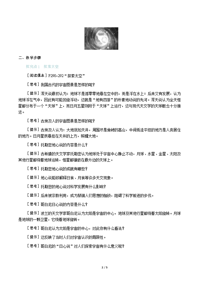 【内容简介】一、新课导入你知道天体物理学家霍金吗?其实,从古至今,人类对我们头顶上的星空一直具有浓厚的兴趣,一直在观察、思考、追寻宇宙的结构,你知道在这过程中获得了哪些成就吗? 二、教学步骤探究点1 探索太空[阅读课本]P290~292“探索太空”[思考]我国古代的宇宙图景是怎样的呢?[提示]浑天说最初认为:地球不是孤零零地悬在空中的,而是浮在水上;后来又有发展,认为地球浮在气中,因此有可能回旋浮动,这就是“地有四游”的朴素地动说的先河。浑天说认为全天恒星都分布于一个“天球”上,而日月五星则附于“天球”上运行,这与现代天文学的天球概念十分接近。[思考]古埃及人的宇宙图景是怎样的呢?[提示]古埃及人认为:大地犹如天井,周围尽是耸峙的高山,中间低洼平坦的地方是人类居住的地方。日月星辰悬挂在天井的上方,照耀大地。[思考]托勒密地心说的内容是什么?[提示]古希腊的天文学家托勒密认为地球处于宇宙中心静止不动,月球、水星、金星、太阳及其他行星都绕着地球运转,恒星都镶嵌在最外边的天球上。[思考]托勒密地心说的成就有哪些?[提示]地心说能够解释日食、月食等许多天文现象。[思考]托勒密的地心说对科学发展有什么影响?[提示]后来被宗教利用,成为禁锢人们思想的枷锁,阻碍了科学前进的步伐。