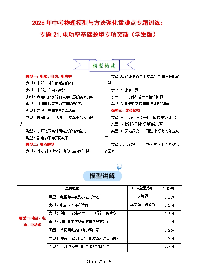 【内容简介】2026年中考物理模型与方法强化重难点专题训练:专题21.电功率基础题型专项突破(学生版和教师版)