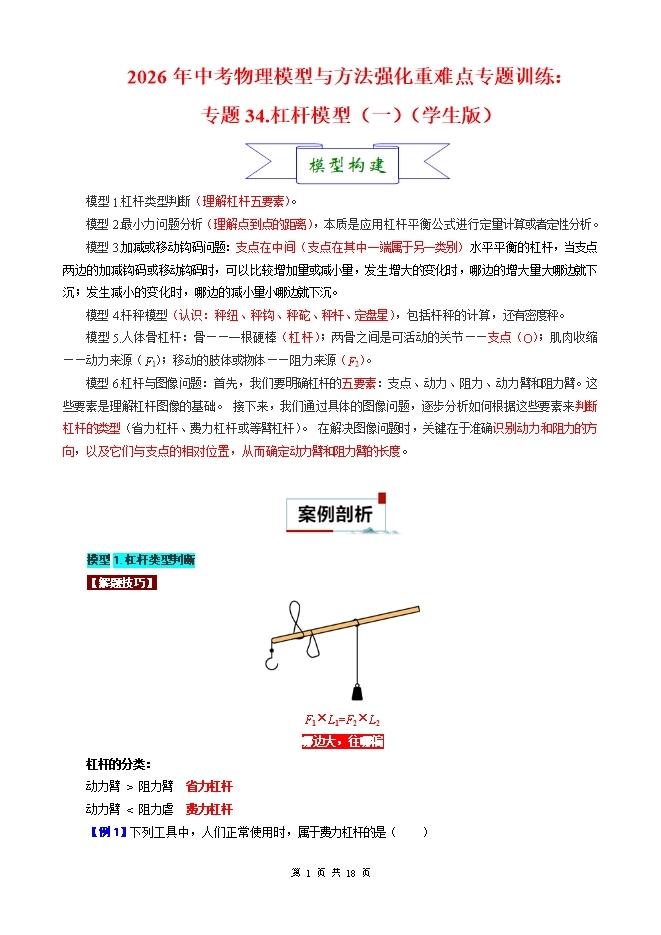 【内容简介】2026年中考物理模型与方法强化重难点专题训练:专题34.杠杆模型(一)(学生版和教师版)