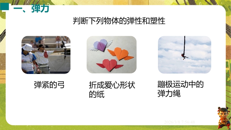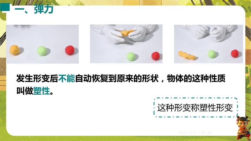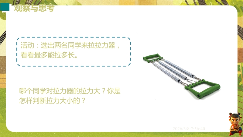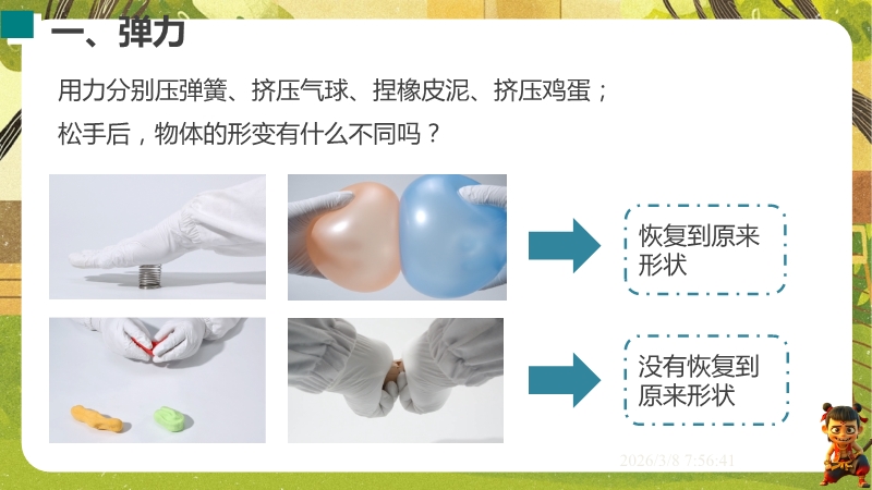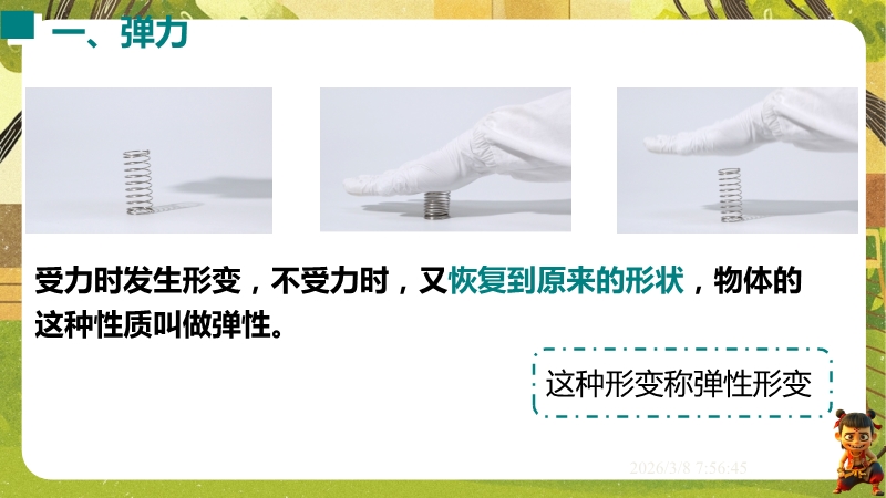 【内容简介】课件聚焦“弹力、力的测量和表示”,通过拉拉力器、压弹簧等互动活动导入,引导学生从生活现象区分弹性与塑性形变,进而理解弹力定义、产生条件及方向,再学习弹簧测力计的构造与使用,最后掌握力的示意图画法,构建完整知识脉络。其亮点在于融合科学探究与情境应用,如“小奶龙”玩具、空间站“企鹅服”等实例,培养科学态度与责任;力的示意图教学步骤规范,结合例题与中考题,强化科学思维中的模型建构。学生能在实践中深化物理观念,教师可借助清晰结构提升教学效率。
