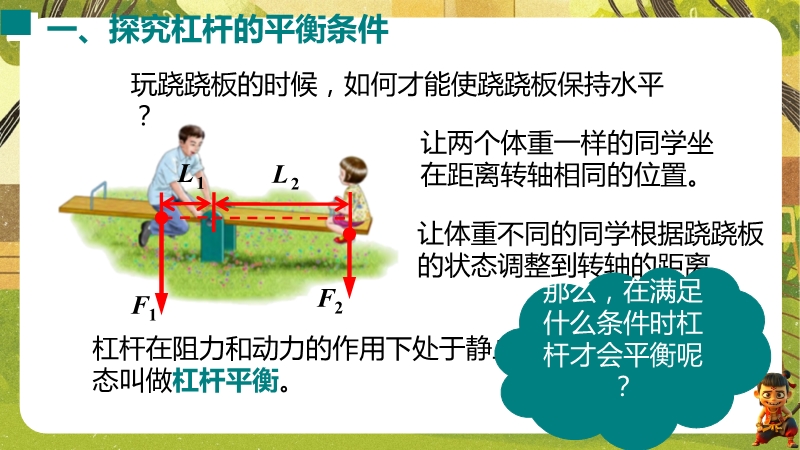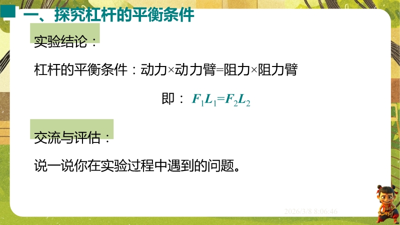 【内容简介】课件聚焦杠杆核心知识,涵盖杠杆定义、五要素、平衡条件及应用分类。通过“观察工具共同点”导入,从生活实例抽象出杠杆模型,逐步引导学生探究平衡条件,构建“概念-实验-应用”的学习支架。其亮点在于融合科学探究与科学思维,通过实验设计、数据记录及交流评估培养探究能力,结合生活实例(如撬棒、人体杠杆)和中考题分层训练,帮助学生形成物理观念。教师可利用其系统资源提升教学效率,学生能提升知识应用与问题解决能力。