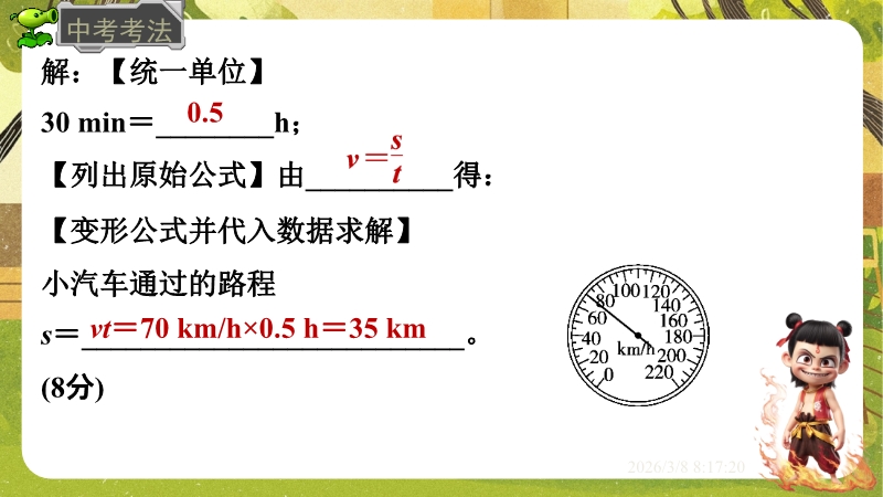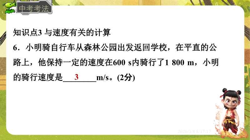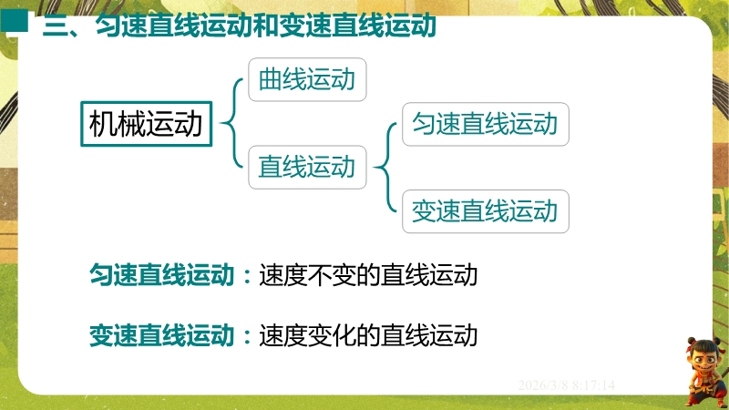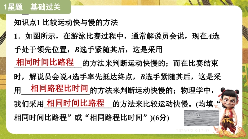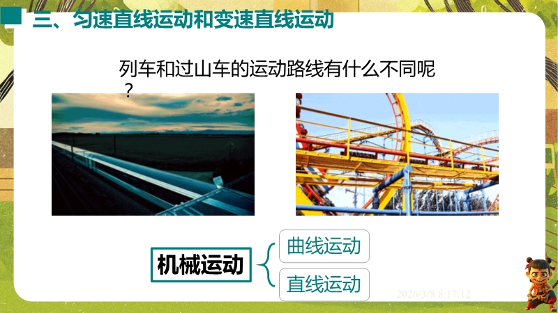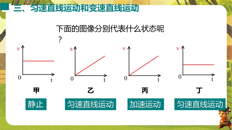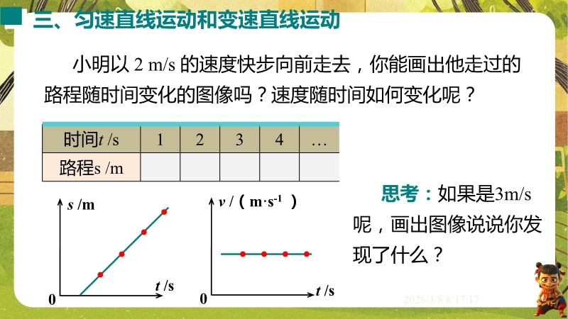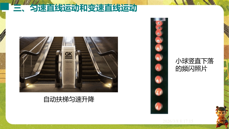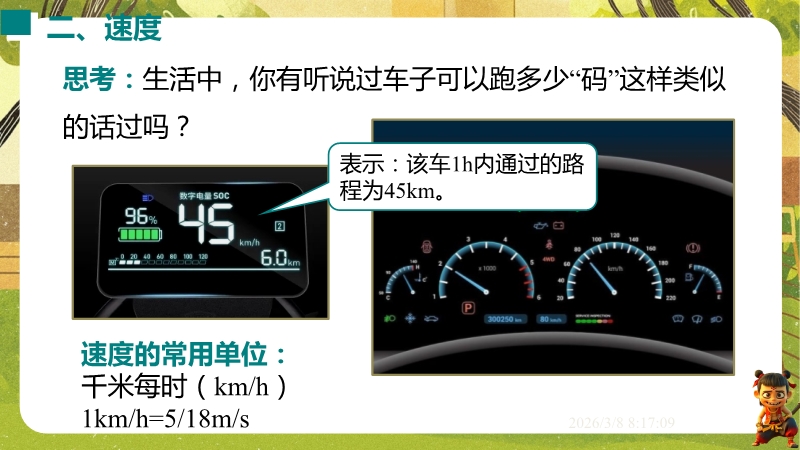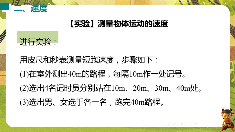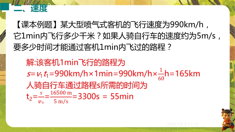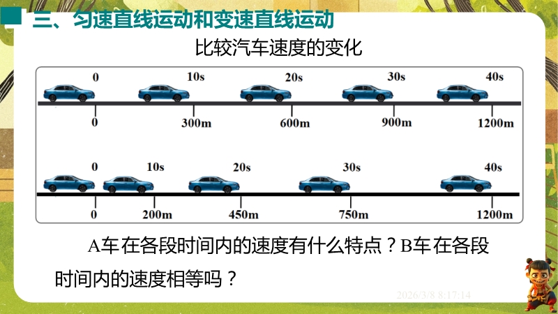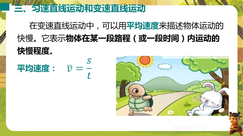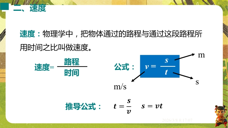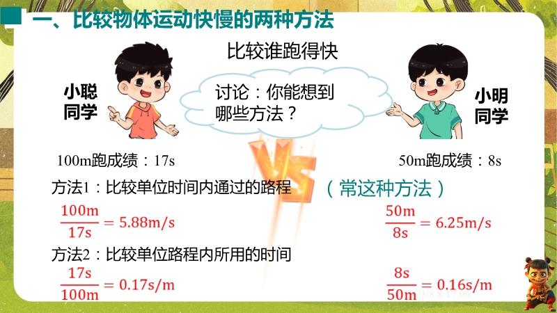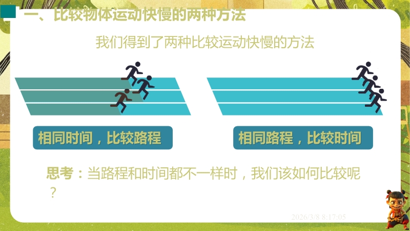 【内容简介】课件围绕“运动的快慢 速度”,系统讲解比较运动快慢的两种方法、速度的定义公式单位及换算、匀速与变速直线运动,通过“路程时间不同时如何比较快慢”的问题导入,结合小聪和小明跑步实例分析方法,搭建从生活到物理概念的学习支架。其亮点在于融合物理观念与科学思维,通过单位换算推导(如1m/s=3.6km/h的详细过程)、课本例题及汽车行驶计算培养科学推理,设置“测量短跑速度”实验落实科学探究,结合“千里江陵一日还”诗词、八百里加急等传统文化与生活实例渗透科学态度。学生能联系生活理解物理概念,教师可借助分层习题和实验指导提升教学效率。