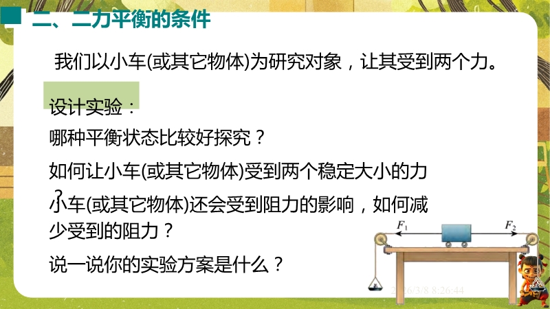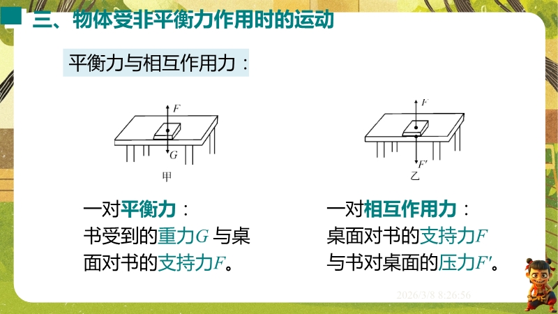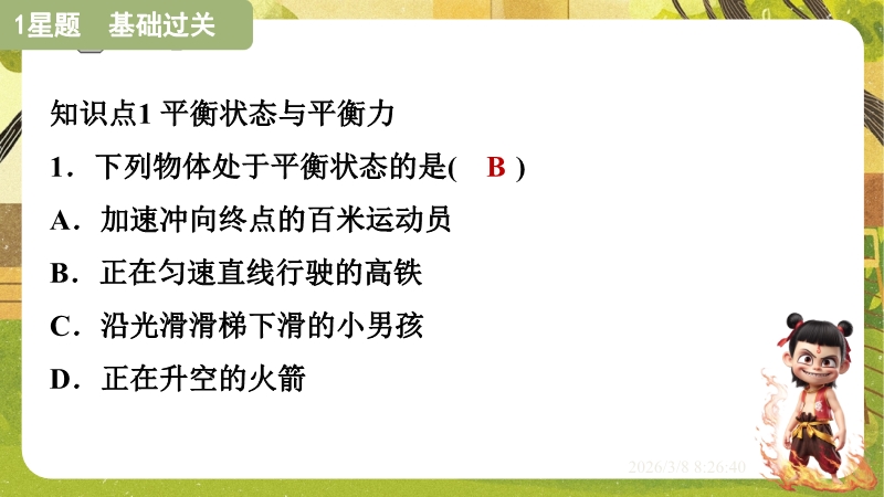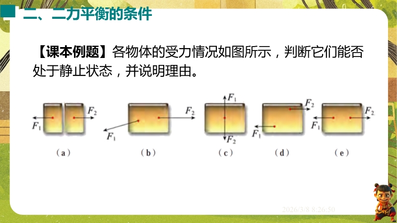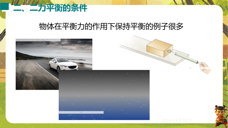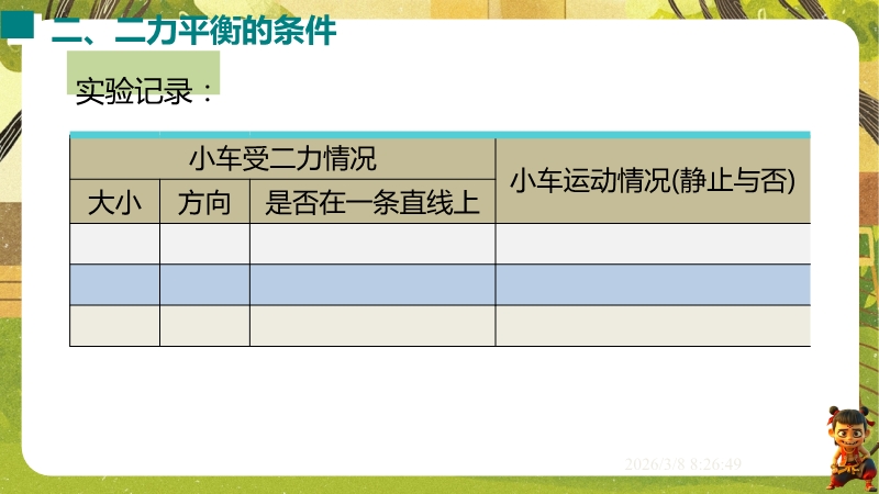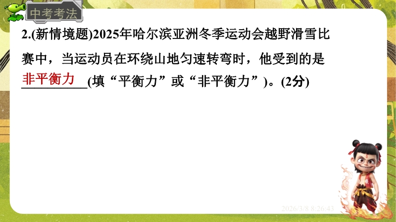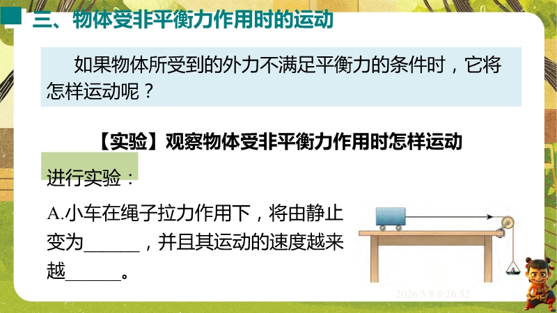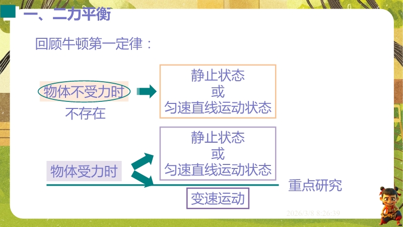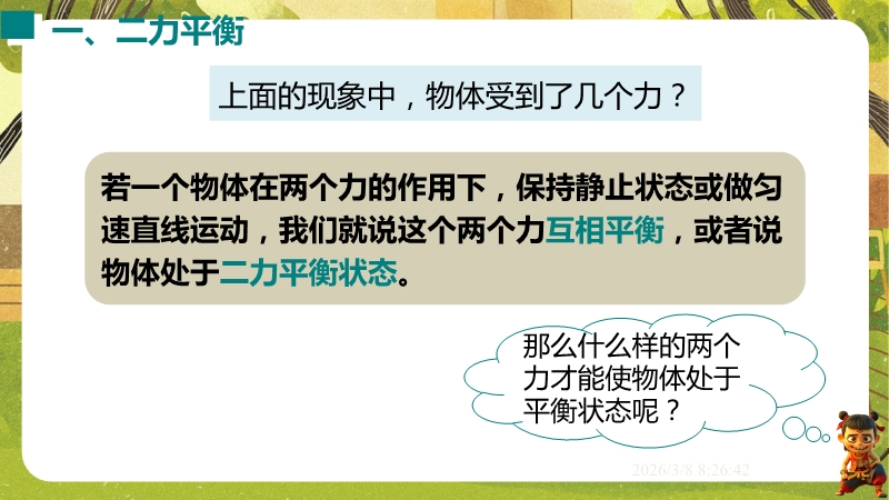 【内容简介】课件聚焦“运动和力”核心内容,涵盖平衡状态、二力平衡条件及非平衡力对运动的影响。通过高铁运动、小鸟静止等生活情境导入,衔接牛顿第一定律,构建从概念到实验的学习支架。亮点在于以“探究二力平衡条件”实验为核心,运用控制变量法培养科学探究能力,结合亚冬会、包粽子等情境题渗透科学态度与责任。分层练习(1星基础、2星应用)助力学生深化物理观念,教师可直接用于教学提升效率。