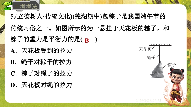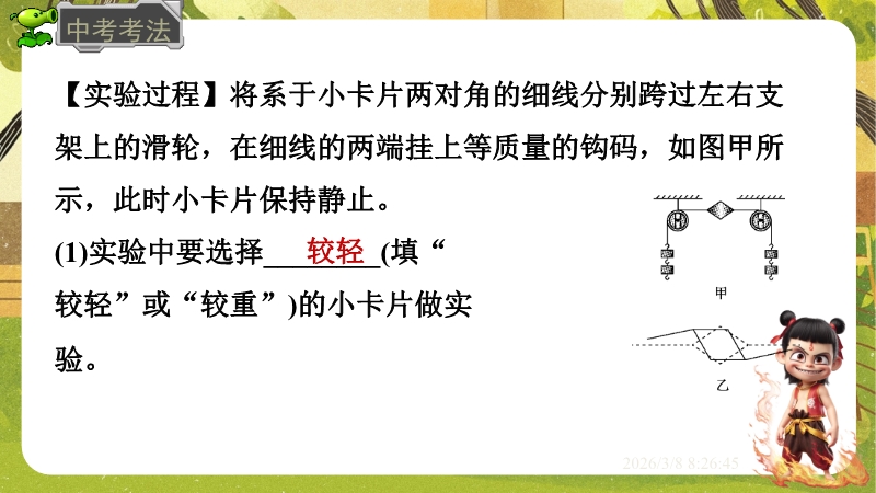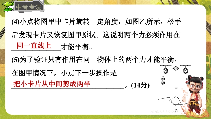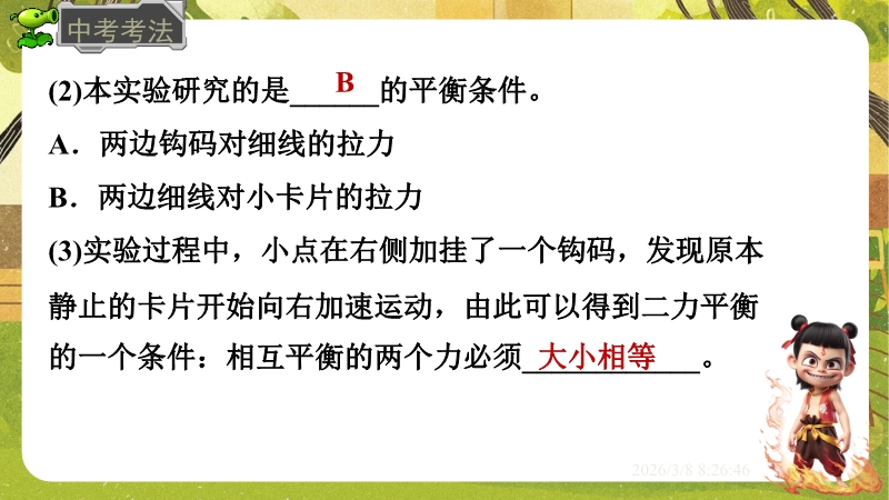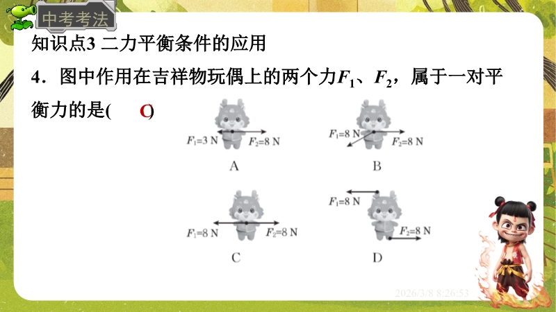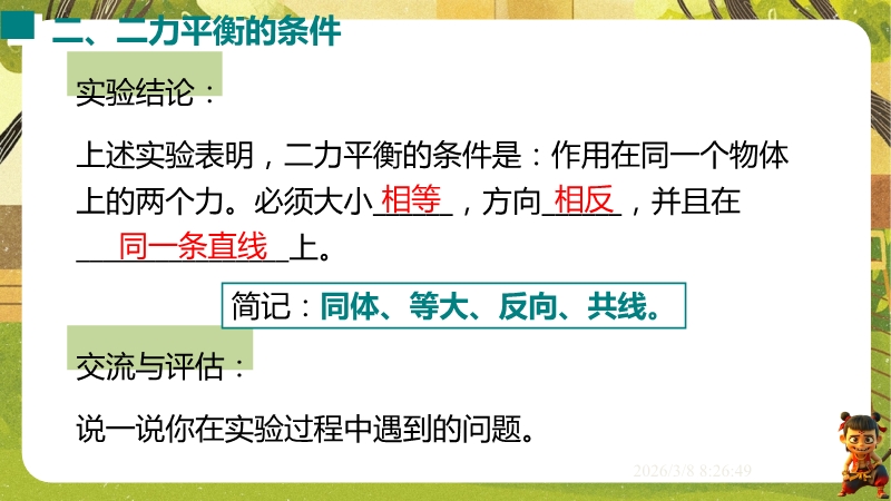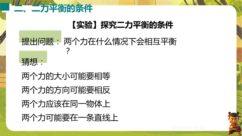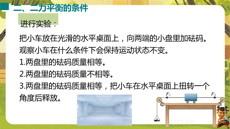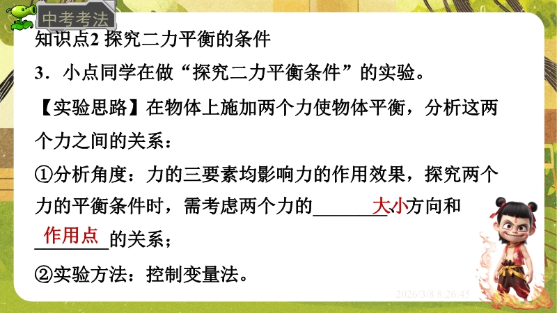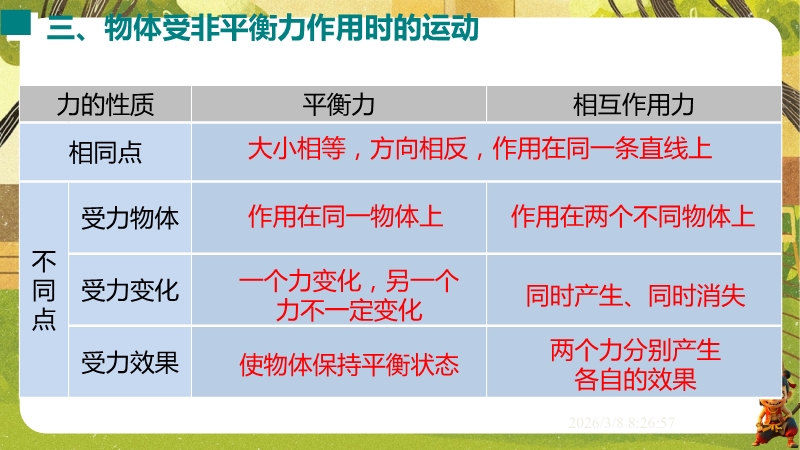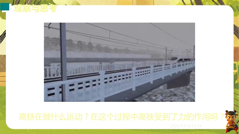 【内容简介】课件聚焦“运动和力”核心内容,涵盖平衡状态、二力平衡条件及非平衡力对运动的影响。通过高铁运动、小鸟静止等生活情境导入,衔接牛顿第一定律,构建从概念到实验的学习支架。亮点在于以“探究二力平衡条件”实验为核心,运用控制变量法培养科学探究能力,结合亚冬会、包粽子等情境题渗透科学态度与责任。分层练习(1星基础、2星应用)助力学生深化物理观念,教师可直接用于教学提升效率。
