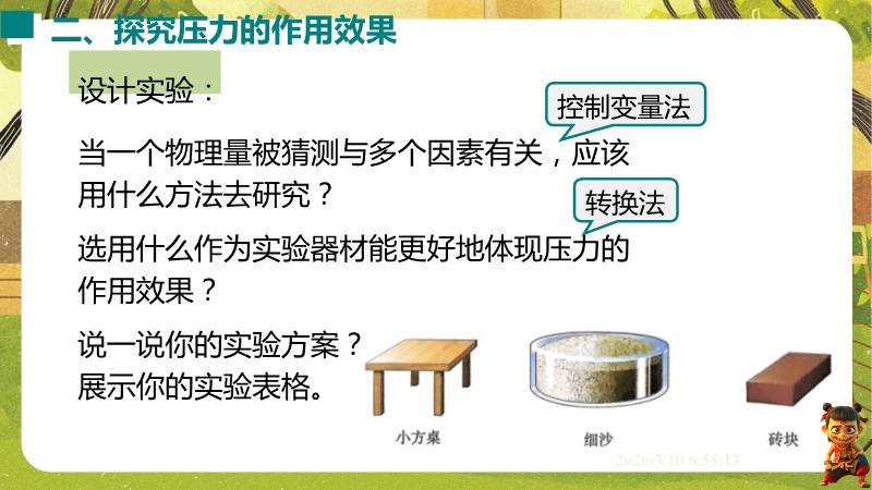 【内容简介】课件聚焦“压强”核心知识点,通过蚊子吸血、骆驼踏沙等生活现象导入,引导学生从压力的定义、方向、作用效果入手,经实验探究影响因素,逐步建立压强概念及公式,形成从现象到规律再到应用的学习脉络。其亮点在于以科学探究为主线,通过控制变量法和转换法设计实验,结合中考题和生活实例,培养科学思维与物理观念。学生能提升探究能力和知识应用能力,教师可借助丰富例题与结构化小结高效教学。