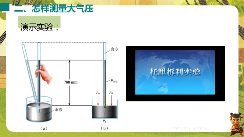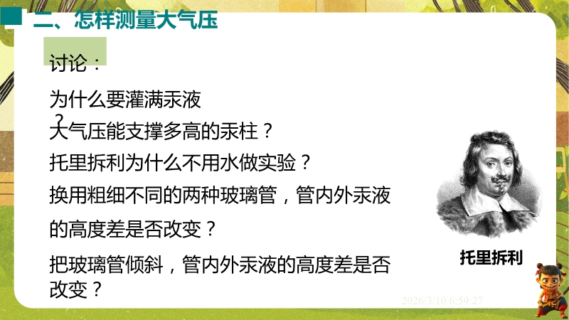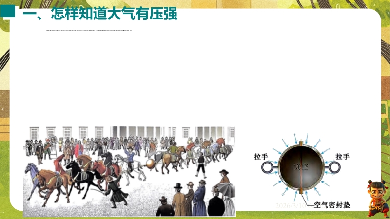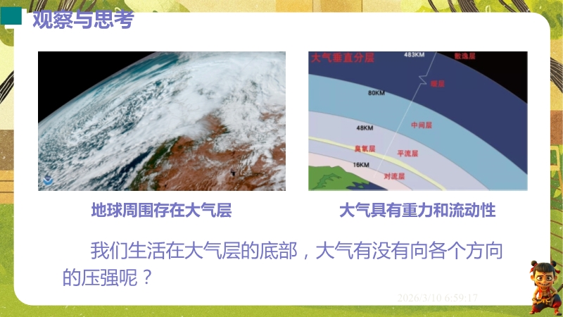 【内容简介】课件聚焦“大气压强与人类生活”,涵盖大气压的存在、测量及应用。通过覆杯实验、吸盘挂钩等体验活动引入,结合马德堡半球实验验证,构建“感知-测量-应用”的学习支架,衔接生活现象与科学原理。其亮点是以科学探究为主线,设计托里拆利实验分析、沸点与气压关系等实验培养科学思维,融入地理海拔、生物呼吸等跨学科实例体现科学态度与责任。学生能提升探究能力,教师可高效落实核心素养教学。