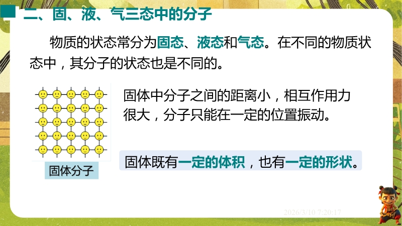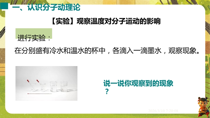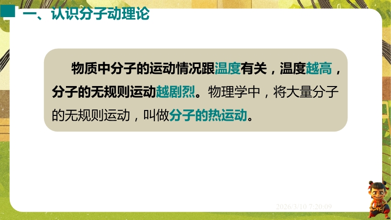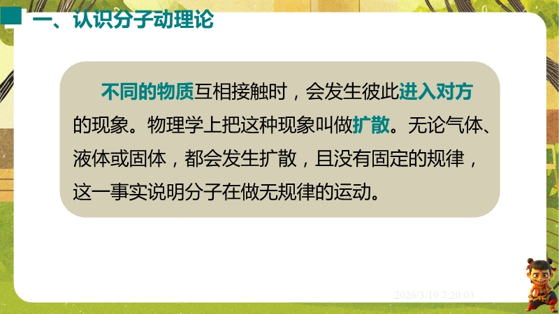 【内容简介】课件聚焦“分子动理论的初步知识”,通过“烟味传播”情境导入,结合香水瓶扩散、红墨水混合等实验,引导学生从生活现象到科学概念,构建分子运动、间隙、作用力及三态分子差异的知识脉络。其亮点在于以实验探究为核心,通过温度影响分子运动实验、铅柱吊钩码等演示,渗透物理观念与科学探究素养,辅以1星基础题和2星情境应用题,帮助学生具象理解抽象概念,教师可借此提升教学互动性与知识落实效率。