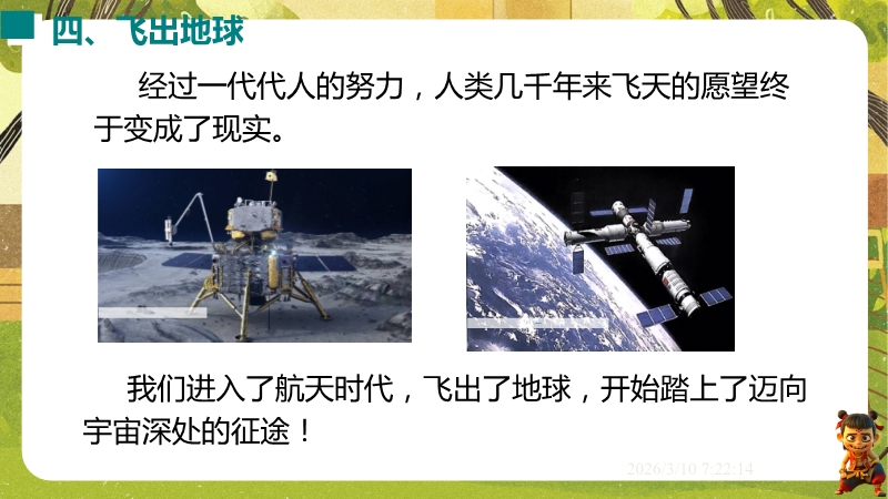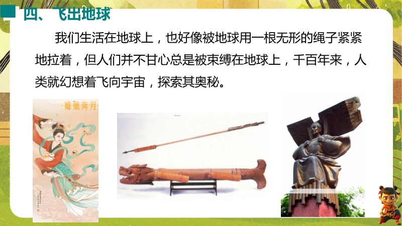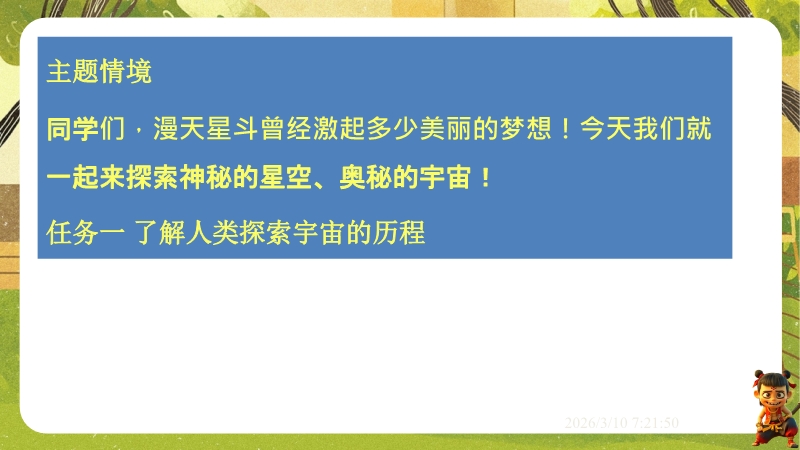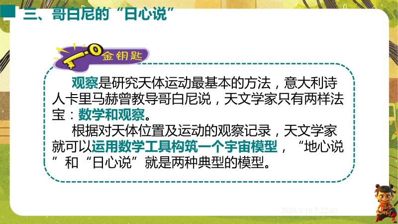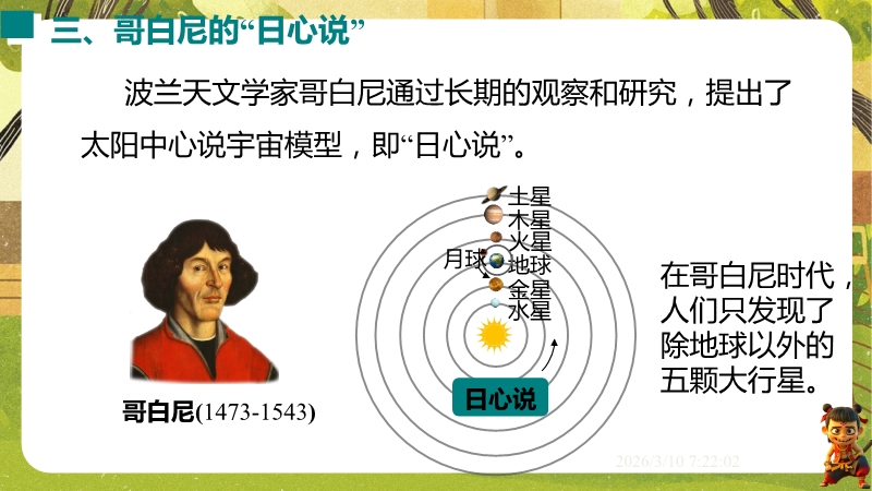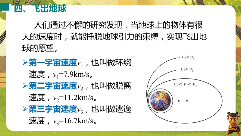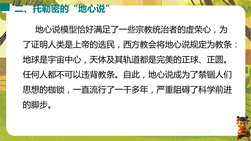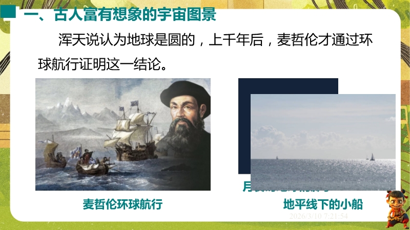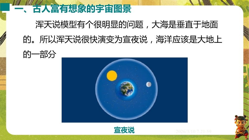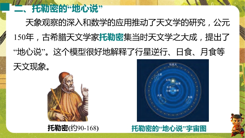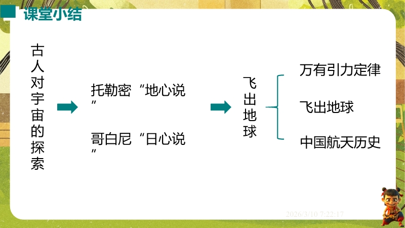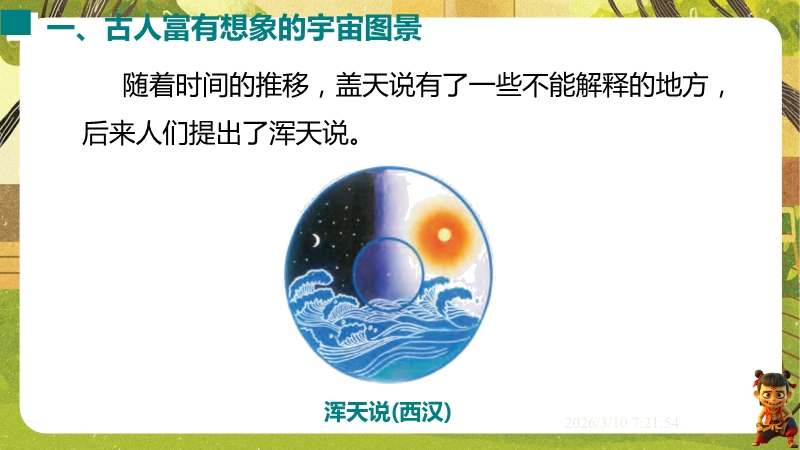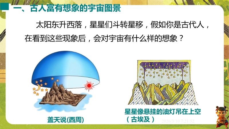 【内容简介】课件围绕“探索宇宙”主题,系统呈现人类探索宇宙的历程,从古人的盖天说、浑天说,到托勒密“地心说”、哥白尼“日心说”,再到万有引力定律及宇宙速度,通过“漫天星斗”情境导入,以任务驱动梳理知识脉络,搭建从古代想象到现代科学的学习支架。其亮点在于融合物理观念(宇宙结构、相互作用)、科学思维(模型建构与对比)和科学态度(科学家探索精神),如对比“地心说”与“日心说”培养模型思维,结合中考题强化应用。助力学生建立时空认知,教师可高效开展教学,提升学生科学探究与责任意识。