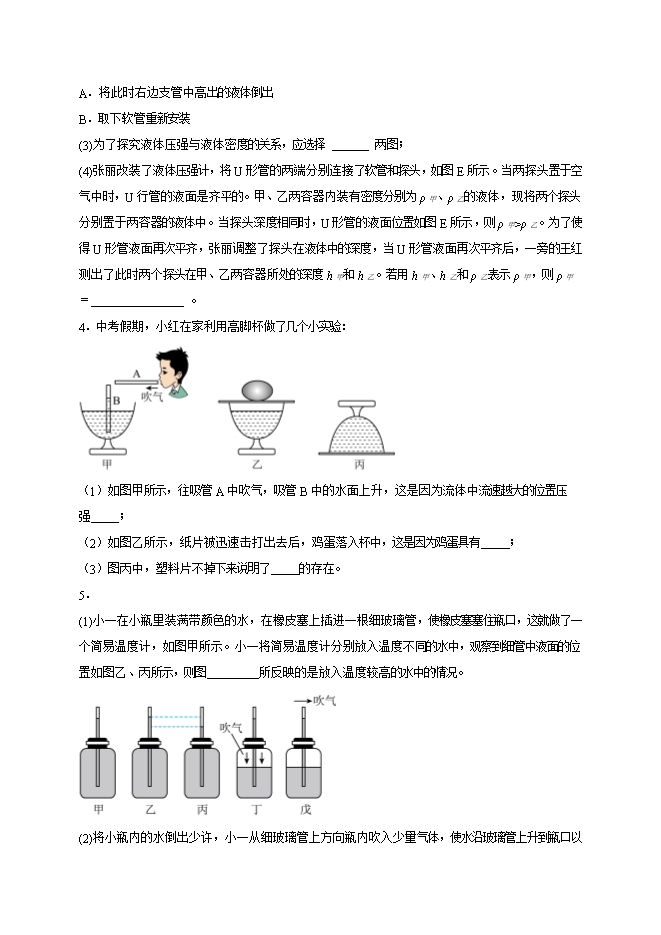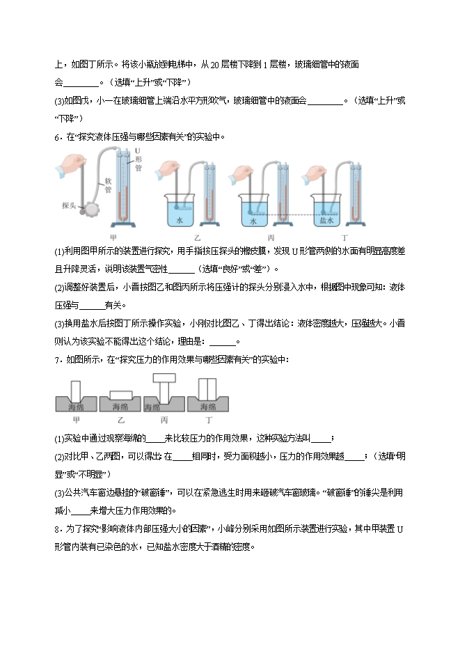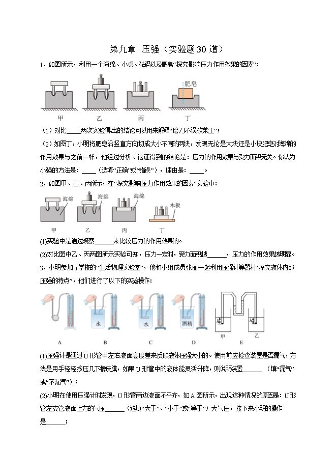 【内容简介】第九章 压强(实验题30道)--2025-2026学年人教版八年级物理全册热点题型专练