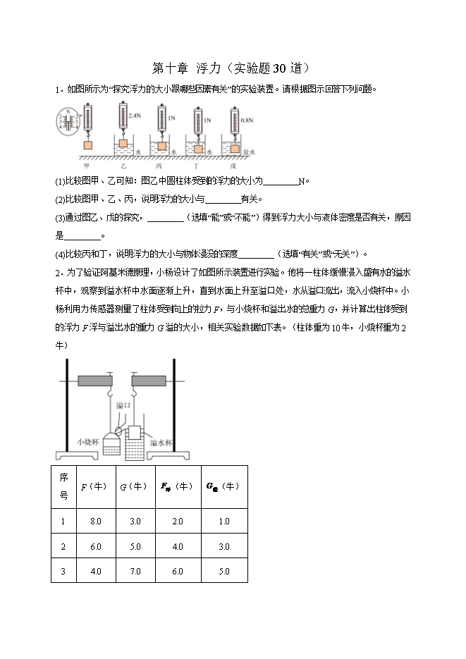 第十章 浮力(实验题30道)--2025-2026学年人教版八年级物理全册热点题型专练