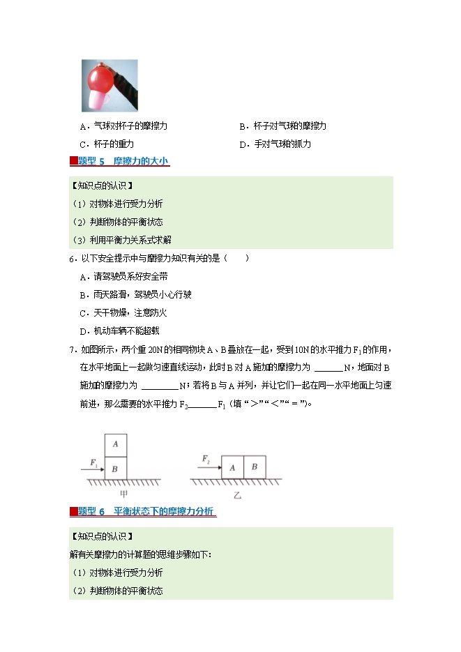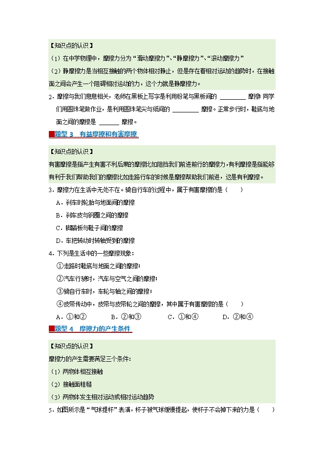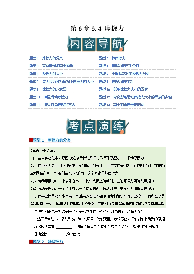 【内容简介】第6章 6.4 摩擦力--2025-2026学年沪粤版物理八年级下册同步考点演练
