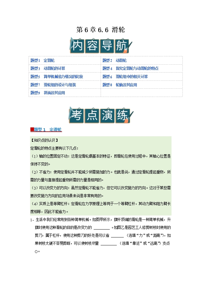 【内容简介】第6章 6.6 滑轮--2025-2026学年沪粤版物理八年级下册同步考点演练