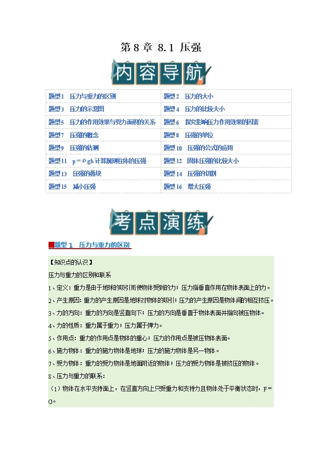 【内容简介】第8章 8.1 压强--2025-2026学年沪粤版物理八年级下册同步考点演练