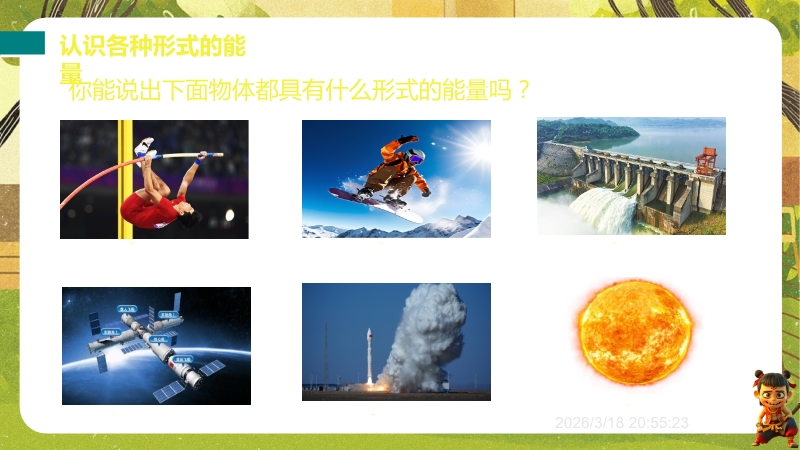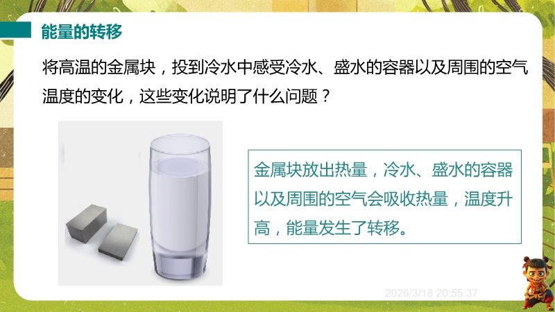 【内容简介】课件聚焦“能量转化与守恒”核心知识点,涵盖能量形式、转化、转移、守恒定律及方向性。通过滑雪、拦河大坝等生活实例提问导入,衔接机械能、内能知识,搭建从具体到抽象的学习支架。其亮点是结合弹力小球弹跳实验、金属块投冷水探究等科学探究活动,通过永动机讨论培养科学思维(质疑创新),以钻木取火、水电站等实例强化能量观念。助力学生深化理解,教师提升教学效率。