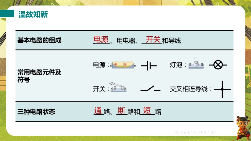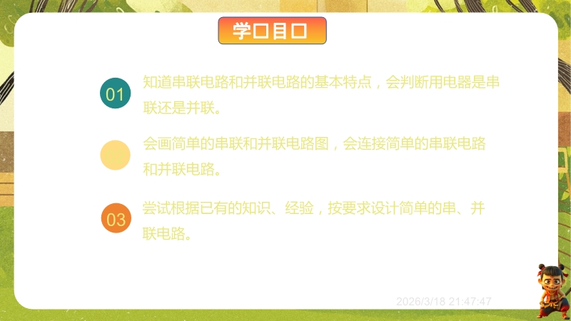 【内容简介】课件聚焦串联与并联电路的特点、开关作用及识别方法。通过“温故知新”回顾电路组成与元件符号,结合“路灯与小彩灯连接方式”的观察思考,以“设计两种电路接法”为支架,衔接旧知与新知,引导学生建构电路连接的物理观念。其亮点在于融合科学思维与科学探究,通过对比表格梳理串并联电路的连接特点、电流路径等(模型建构),设计“拆除法”“节点法”等识别方法(科学推理),结合高铁闸机、家庭电路等生活实例(社会责任)。例题与练习题从基础判断到电路设计,助力学生提升实验操作与问题解决能力,也为教师提供结构化教学资源,提高课堂效率。