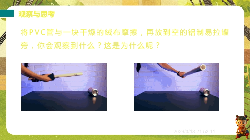 【内容简介】课件围绕“电荷”主题,涵盖摩擦起电现象、两种电荷及相互作用、验电器原理、摩擦起电微观解释和静电应用防护等核心知识点。通过“PVC管摩擦绒布靠近易拉罐”实验导入,引导学生从现象观察到原理探究,构建“现象-规律-本质-应用”的学习支架。其亮点在于注重科学探究与科学思维培养,以实验观察(如验电器构造与原理实验)引导学生建构物理观念,结合油罐车铁链、避雷针等生活实例渗透科学态度与责任。采用“观察-总结-练习”教学环节,帮助学生深化理解,也为教师提供结构化教学资源,提升教学效率。
