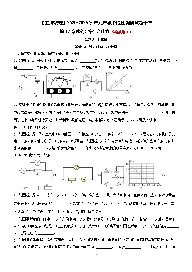 【内容简介】第17章 欧姆定律 培优训练--2025-2026学年九年级阶段性调研试题十三(人教版)【王牌物理河南专版】